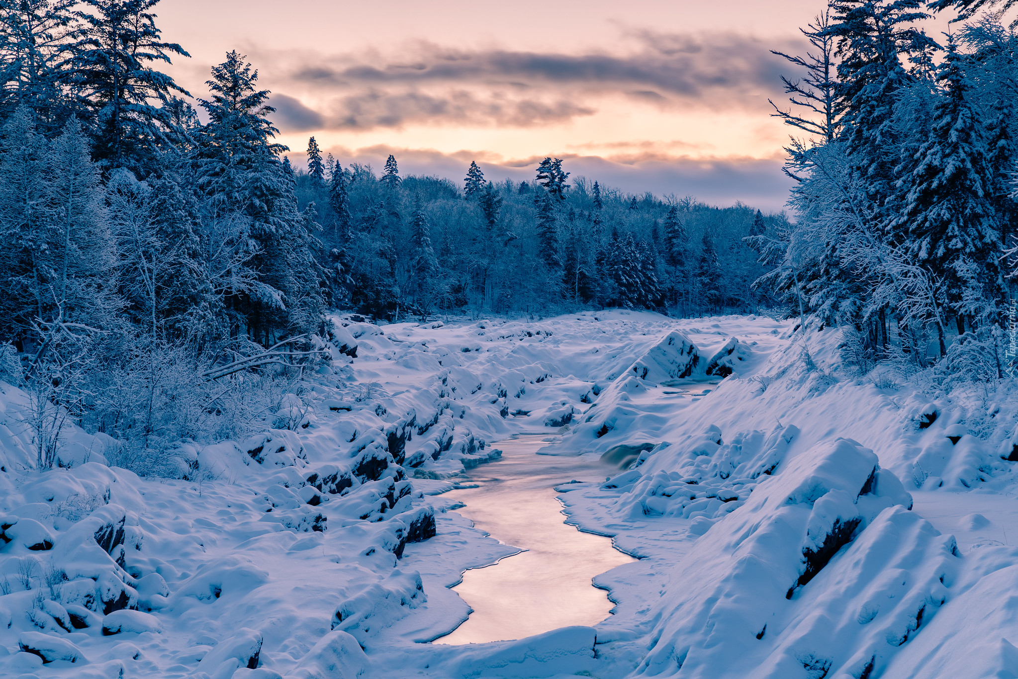 Edytor tapety: Zasypana śniegiem rzeka w lesie