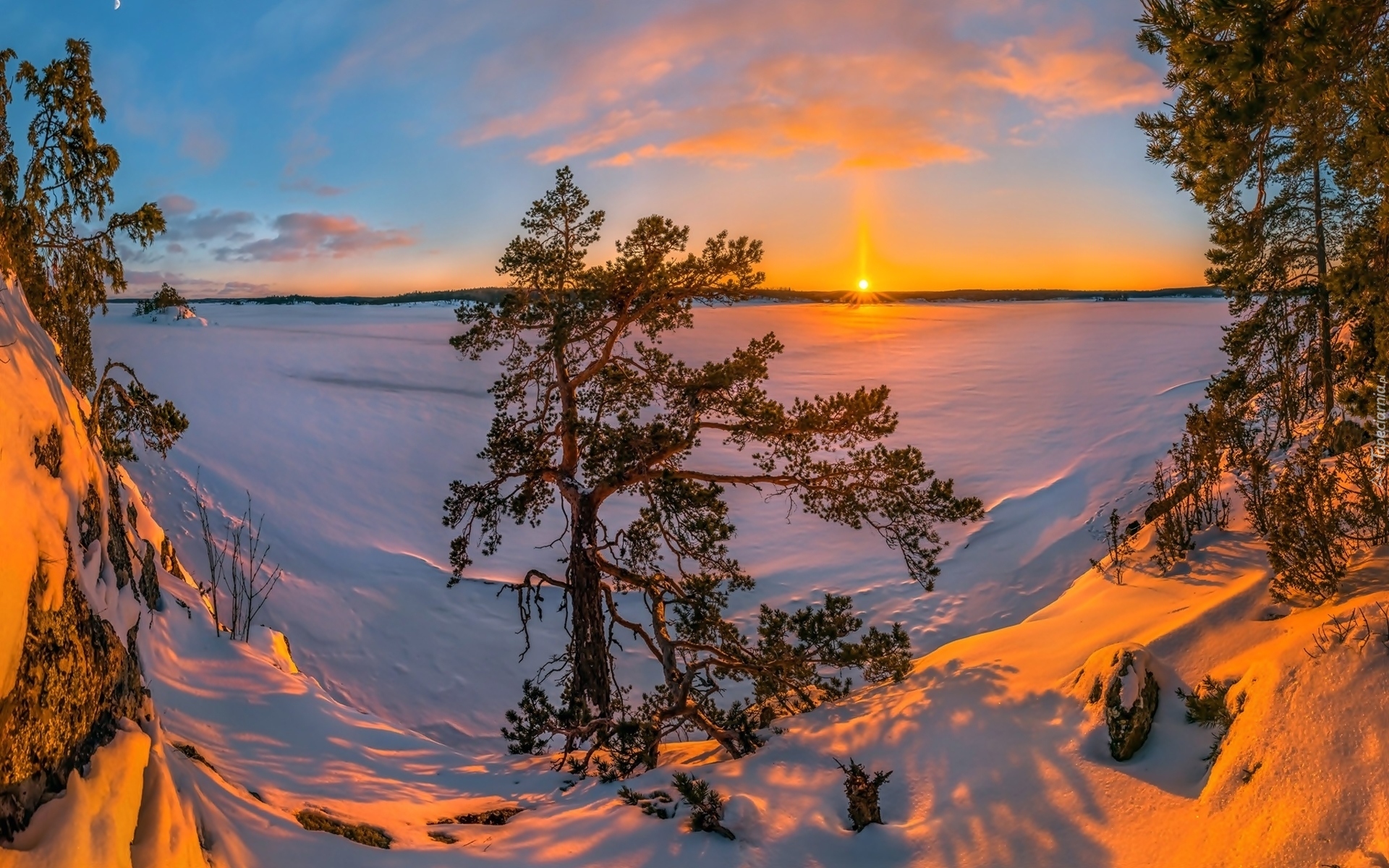 Edytor tapety: Zamarznięte jezioro Ładoga w blasku zachodzącego słońca