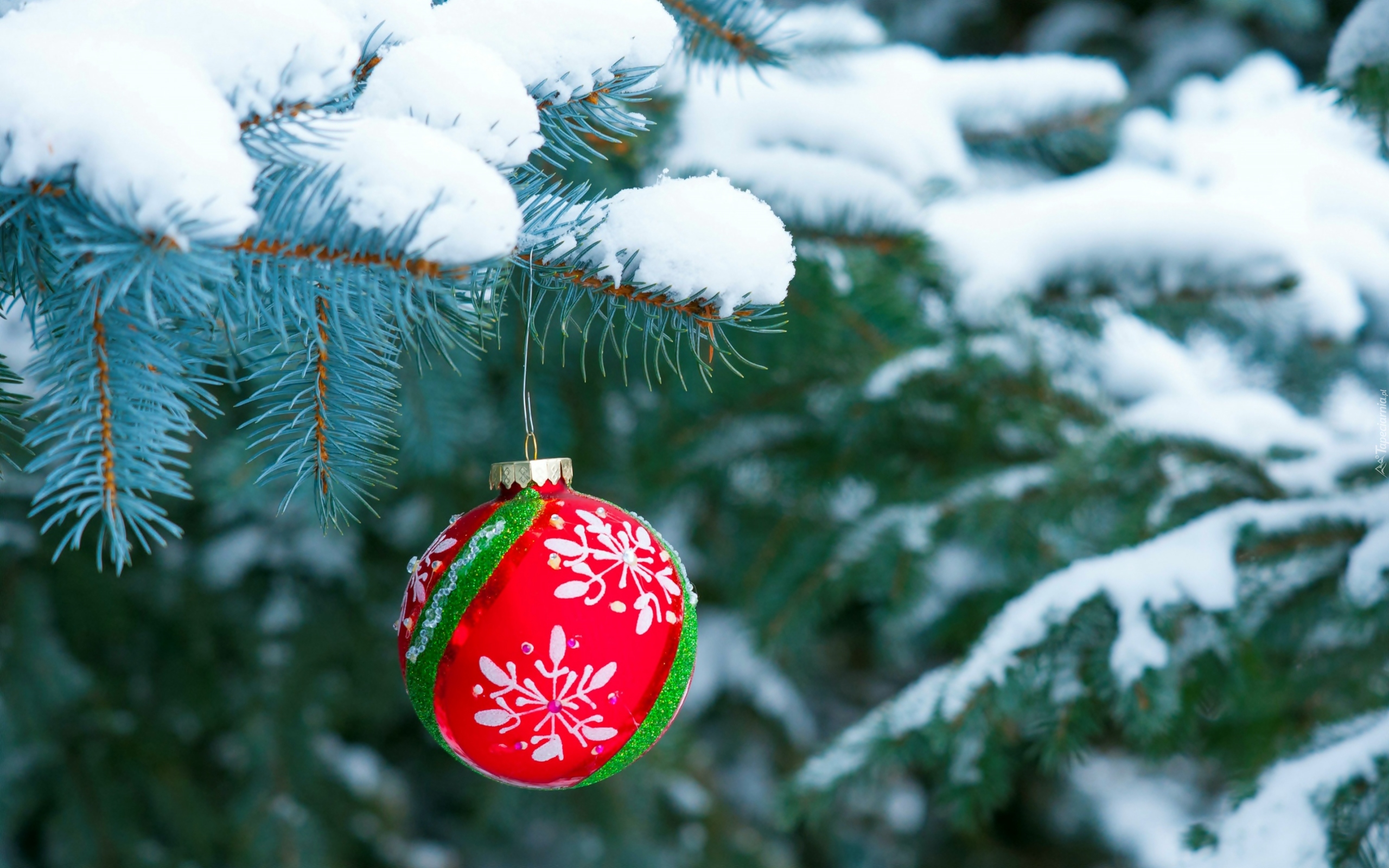 Edytor tapety: Czerwona bombka wisząca na ośnieżonej gałązce