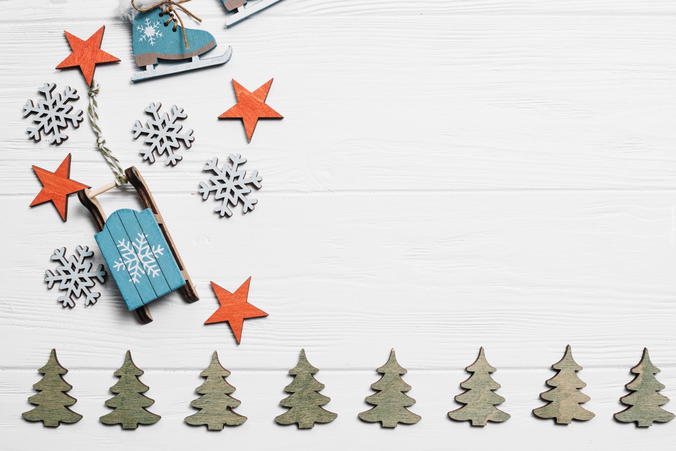 Edytor tapety: Sanki i łyżwy ułożone obok choinek na desce