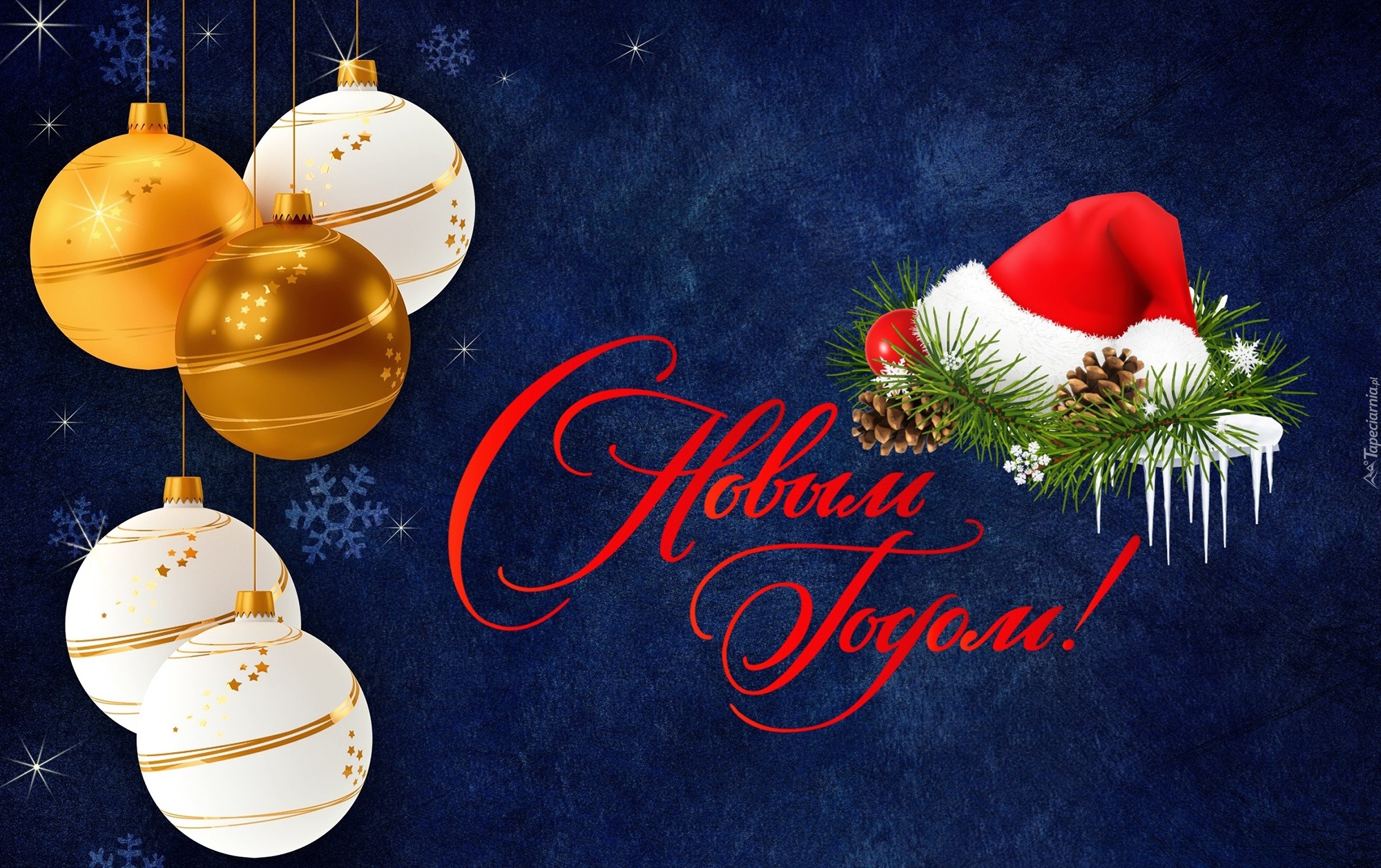 Edytor tapety: Wiszące bombki i czapka Mikołaja obok noworocznych życzeń
