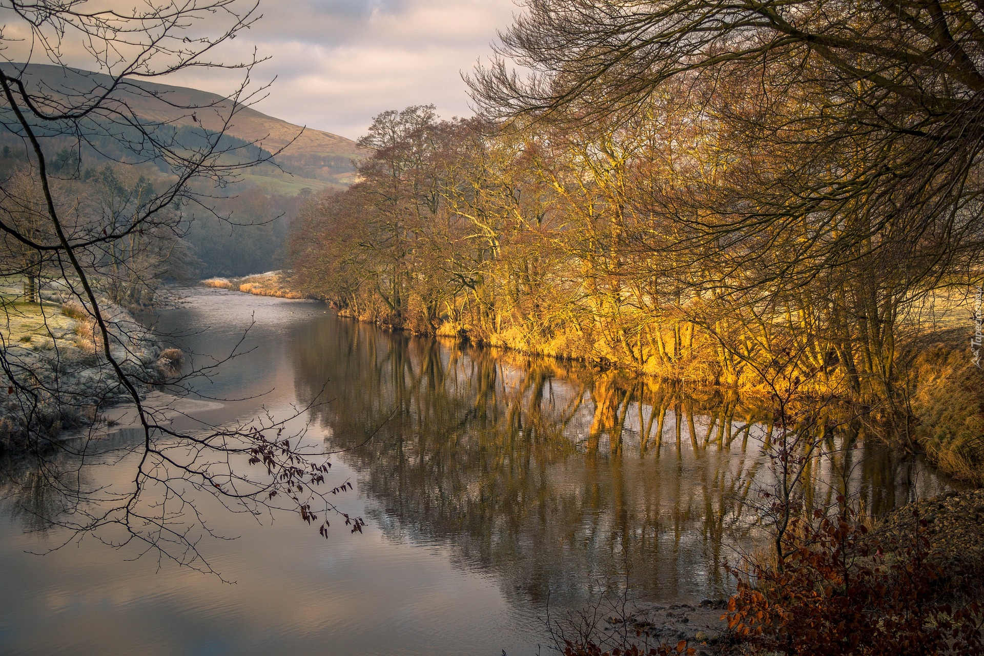 Edytor tapety: Drzewa nad rzeką z widokiem na wzgórza