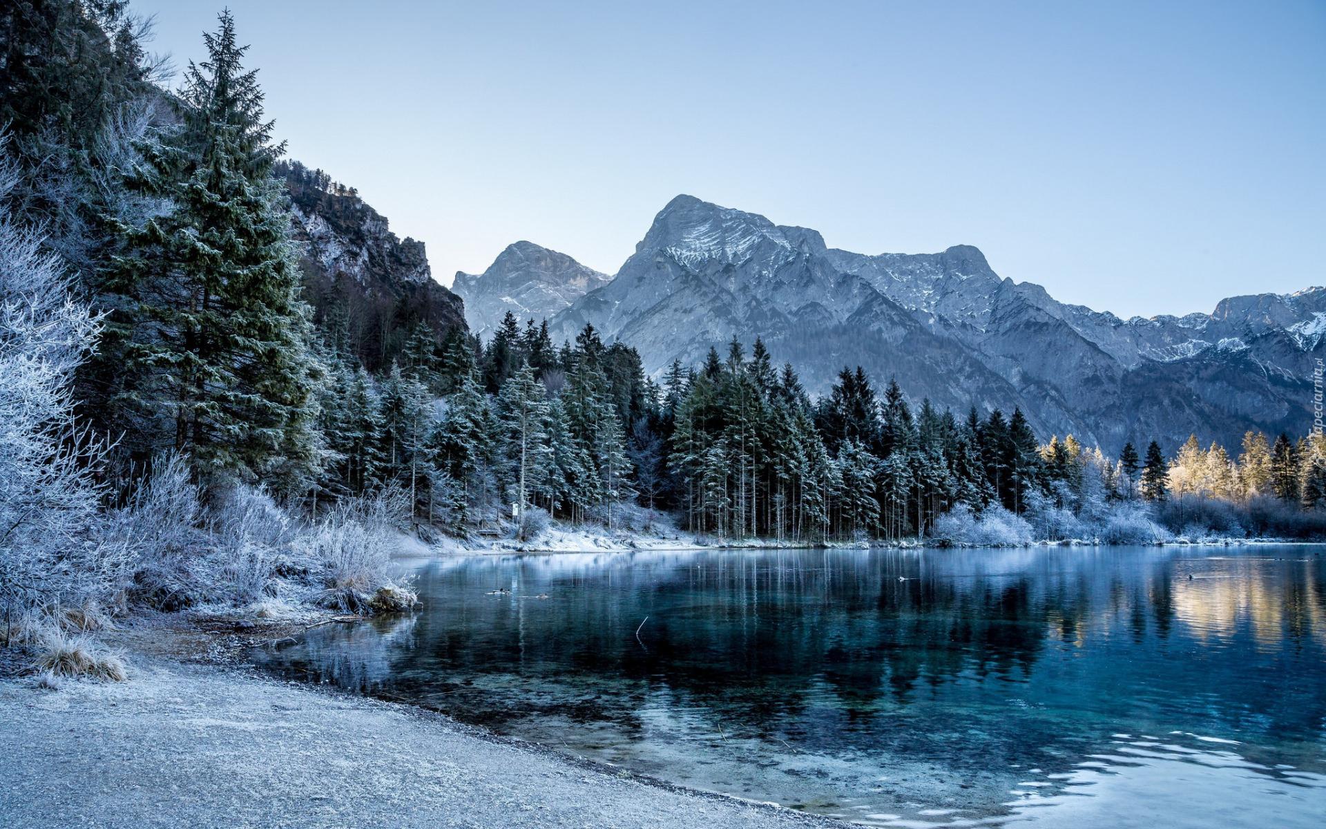 Edytor tapety: Oszronione drzewa nad jeziorem z górami w tle