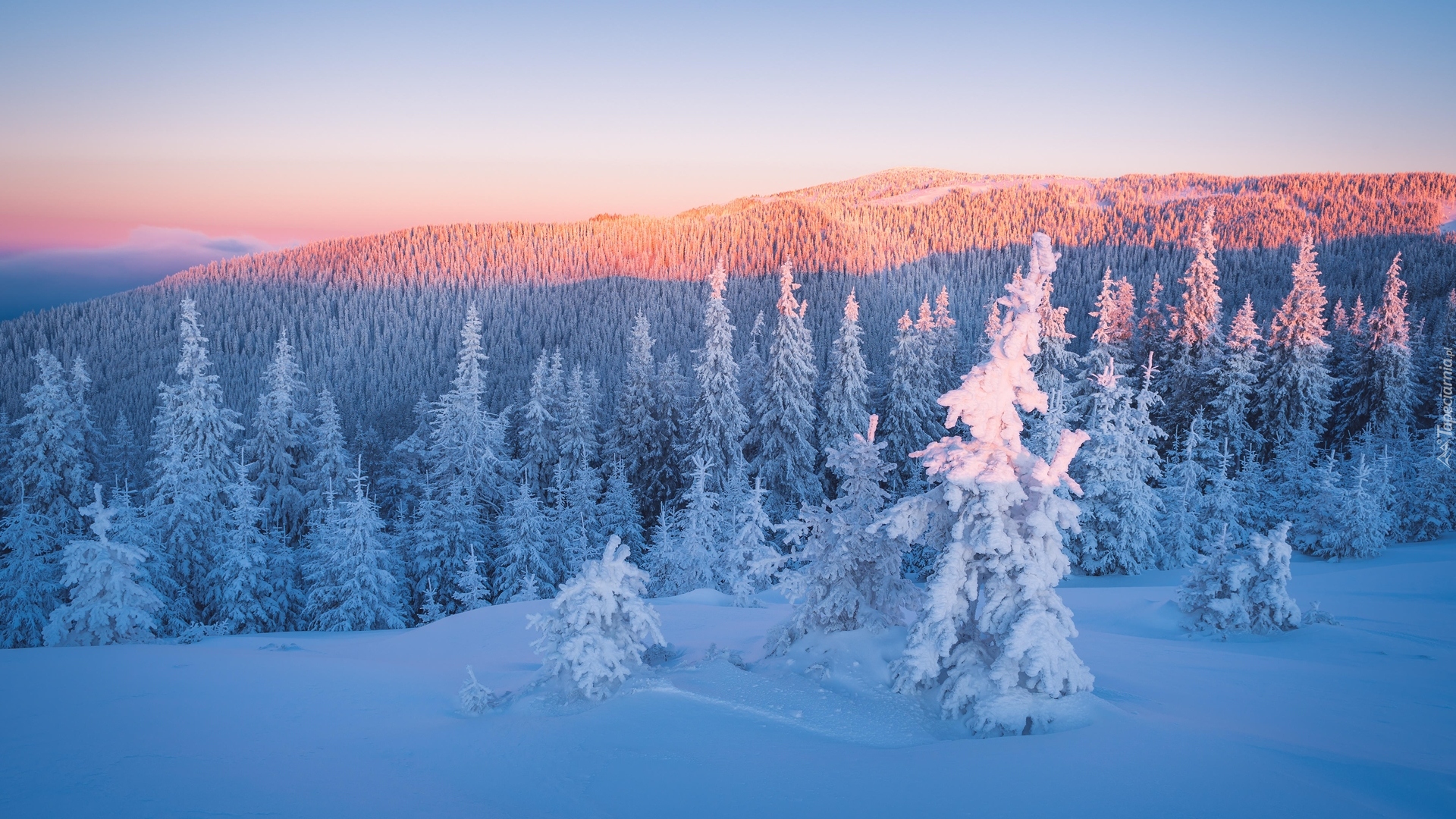 Edytor tapety: Ośnieżone drzewa i góry w słońcu