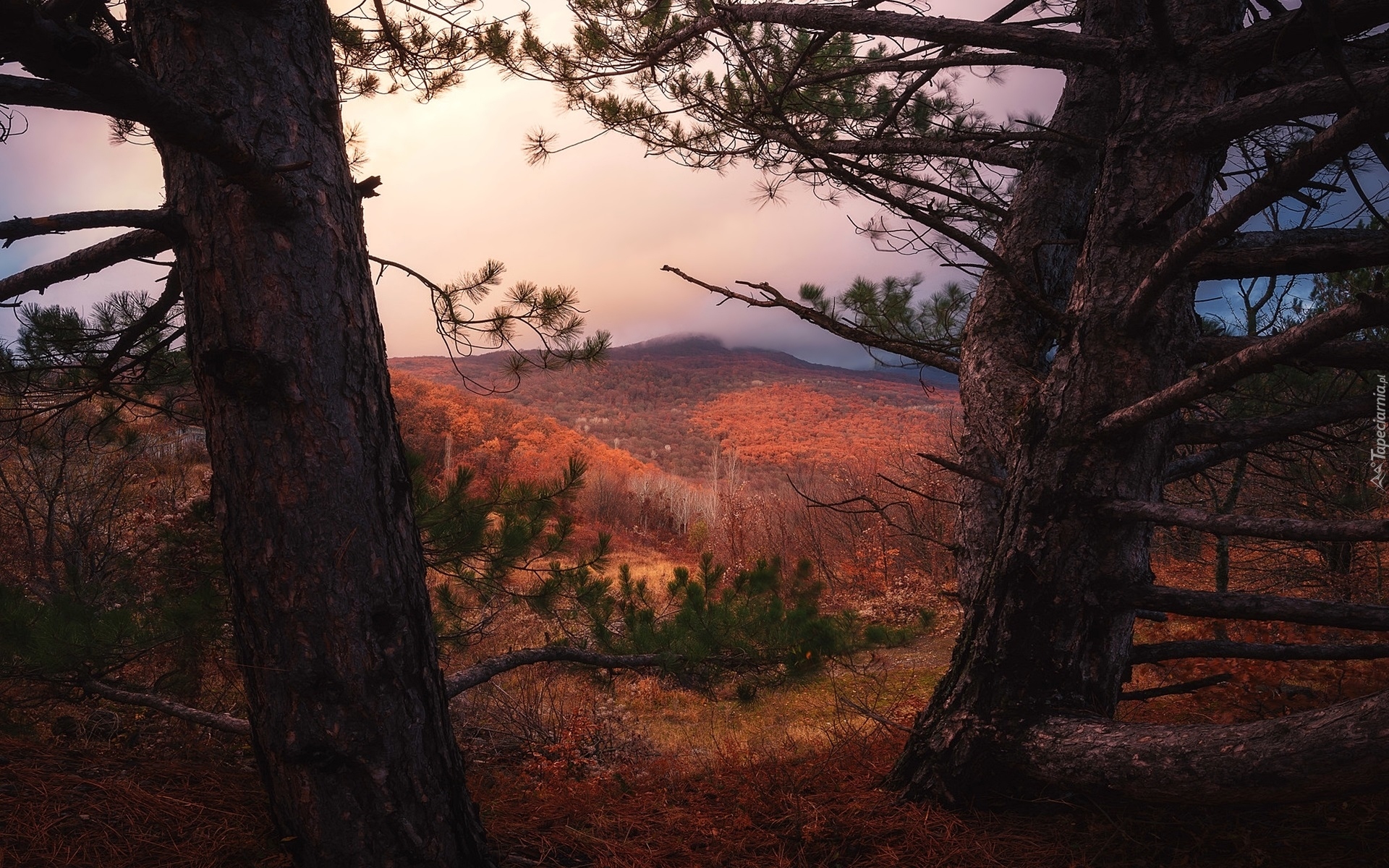 Edytor tapety: Widok zza sosen na jesienne wzgórza