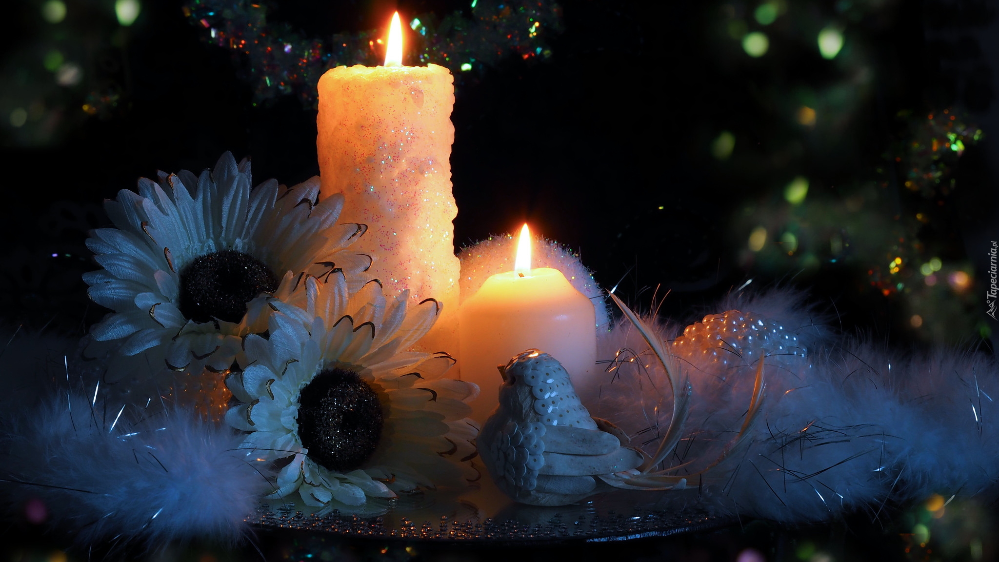 Edytor tapety: Zapalone świece obok figurki ptaka i kwiatów