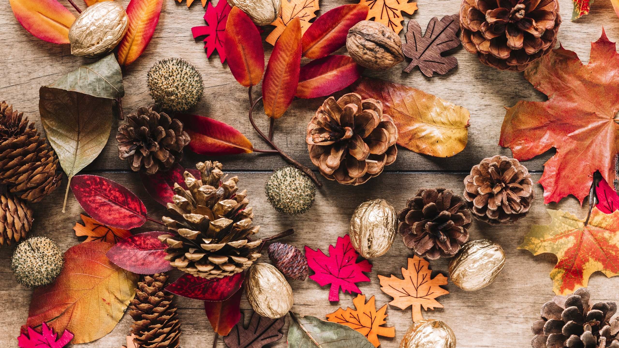 Edytor tapety: Szyszki wśród jesiennych liści i orzechów
