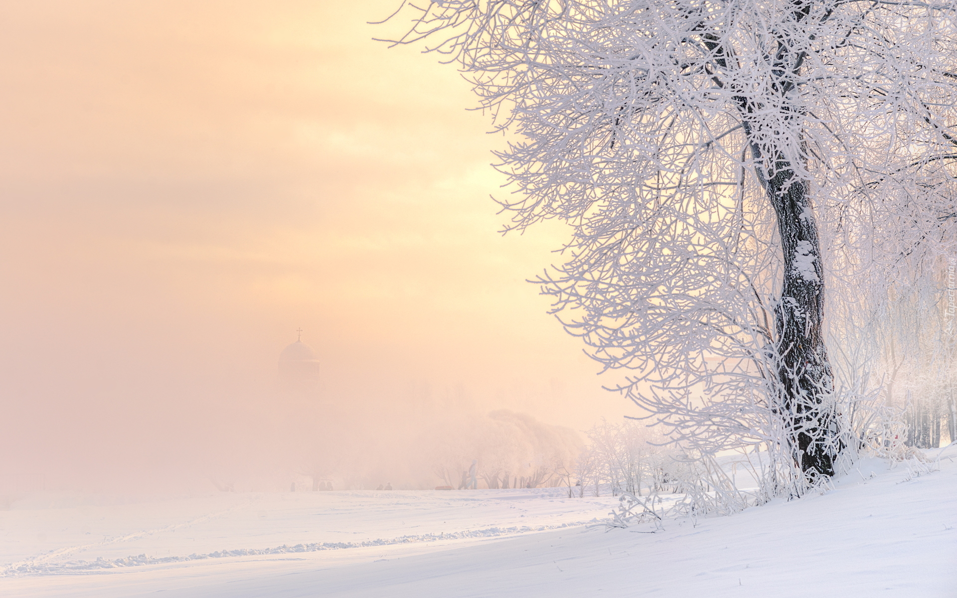 Edytor tapety: Oszronione drzewa na zamglonym polu