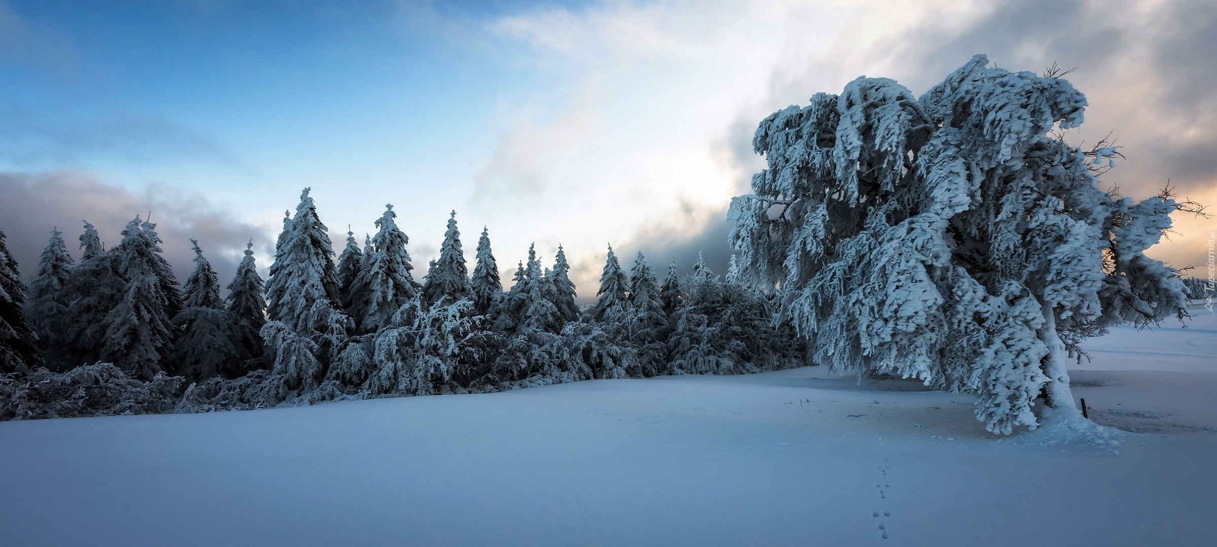 Edytor tapety: Ślady w śniegu pod ośnieżonymi drzewami