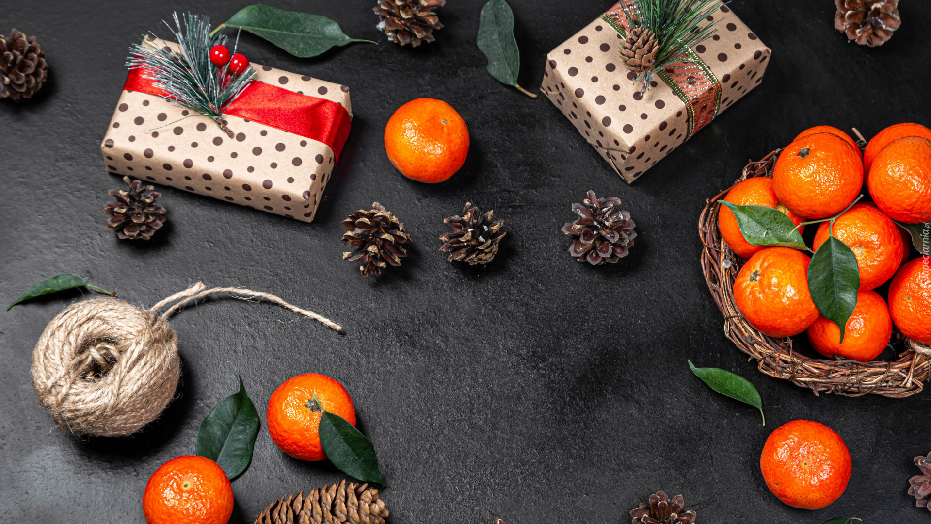 Edytor tapety: Koszyk z mandarynkami obok prezentów i szyszek