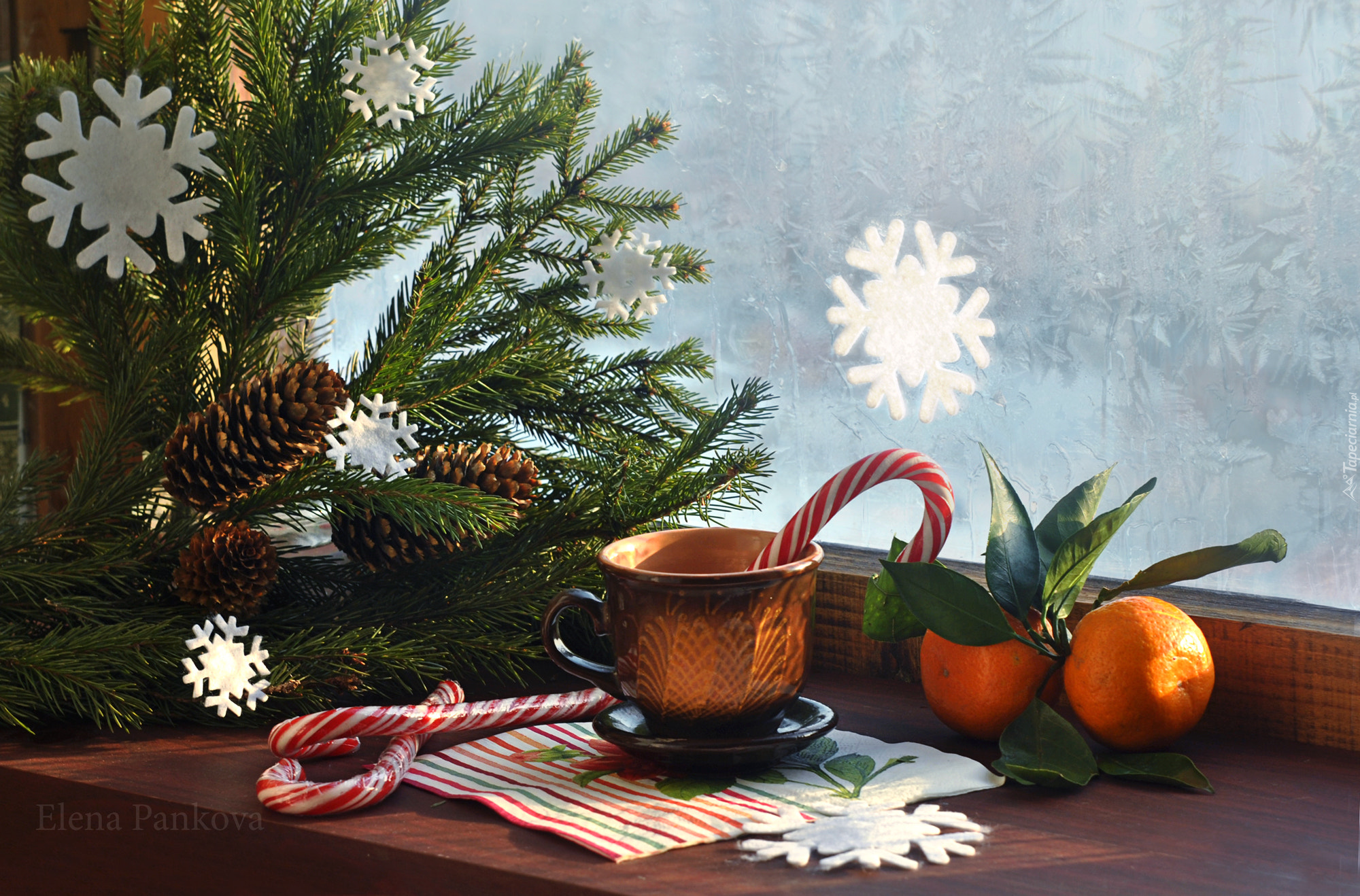Edytor tapety: Lizaki i mandarynki obok gałązek przy oknie