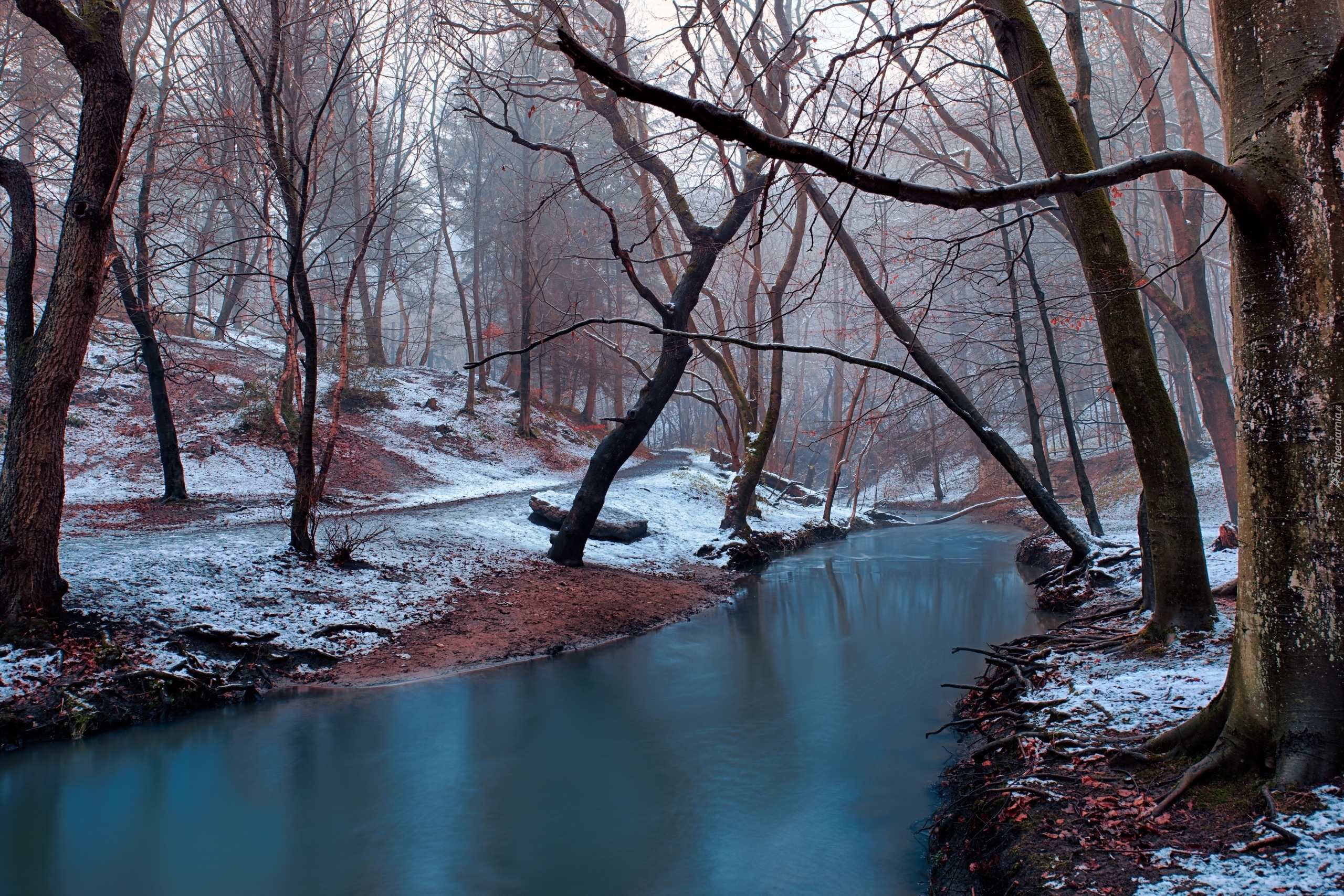 Edytor tapety: Przyprószona śniegiem trawa i drzewa nad rzeką