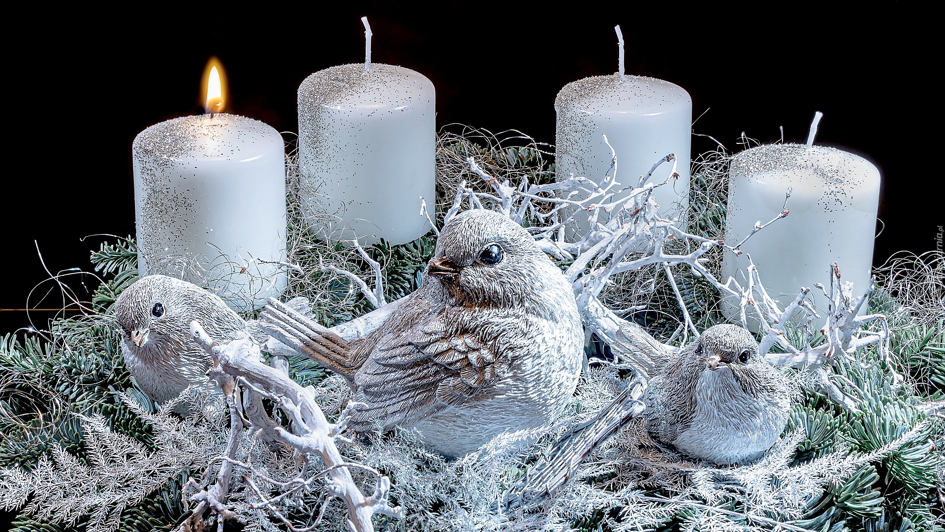 Edytor tapety: Zapalona świeca na stroiku adwentowym