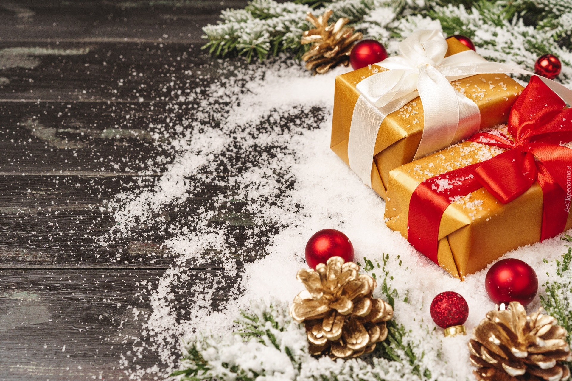 Edytor tapety: Prezenty obok szyszek i bombek na sztucznym śniegu