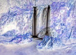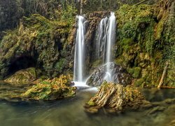 Edytor tapety: Wodospad na omszałej skale porośniętej roślinami