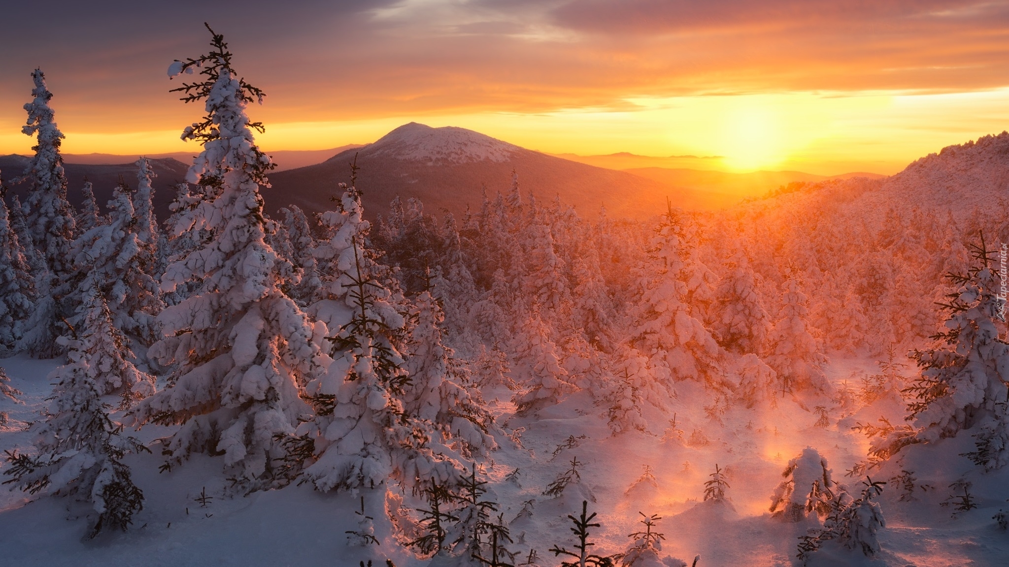 Edytor tapety: Ośnieżony las świerkowy w blasku zachodzącego słońca
