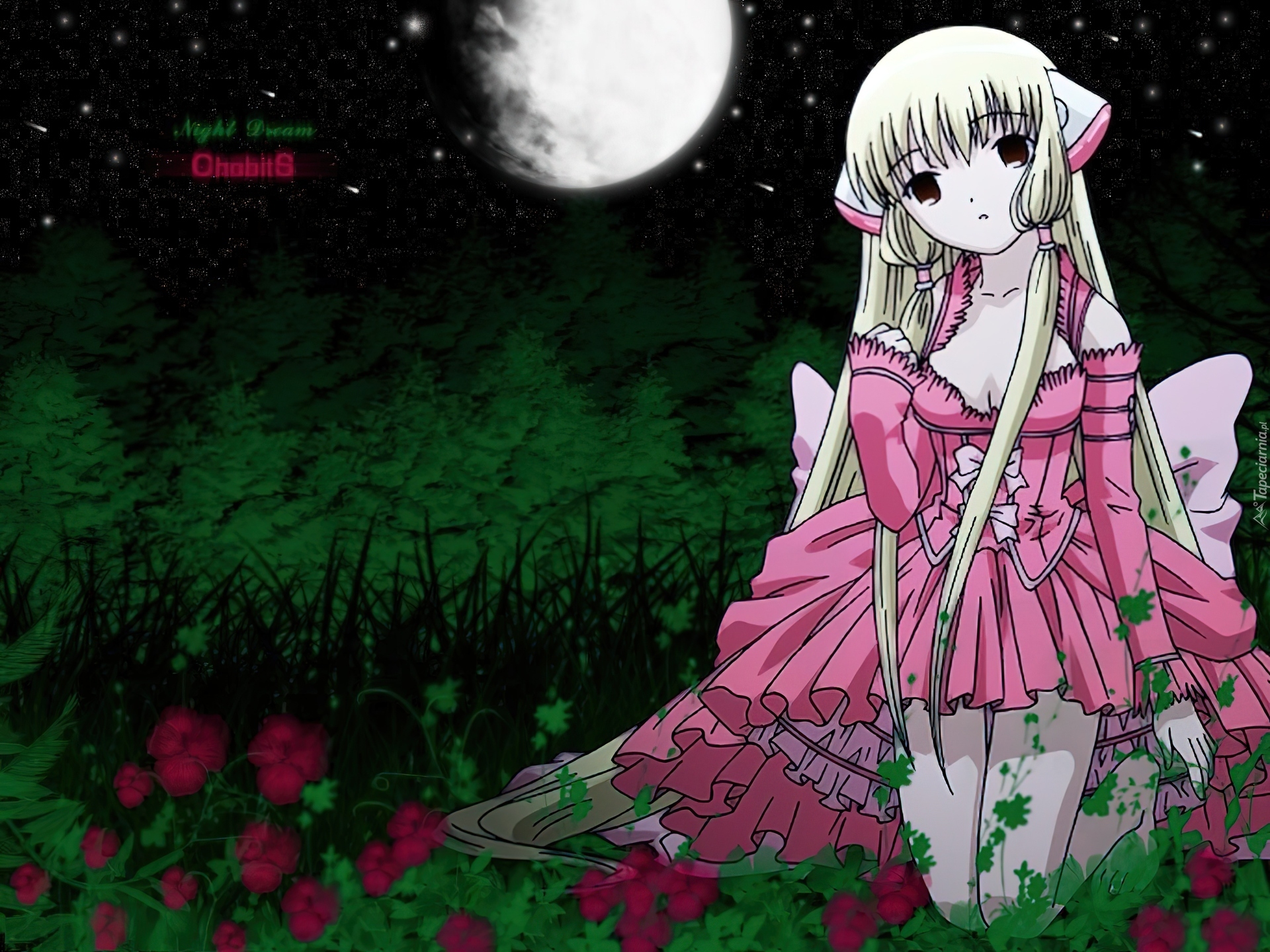 Edytor tapety: Chobits, dziewczyna, księżyc, kwiaty