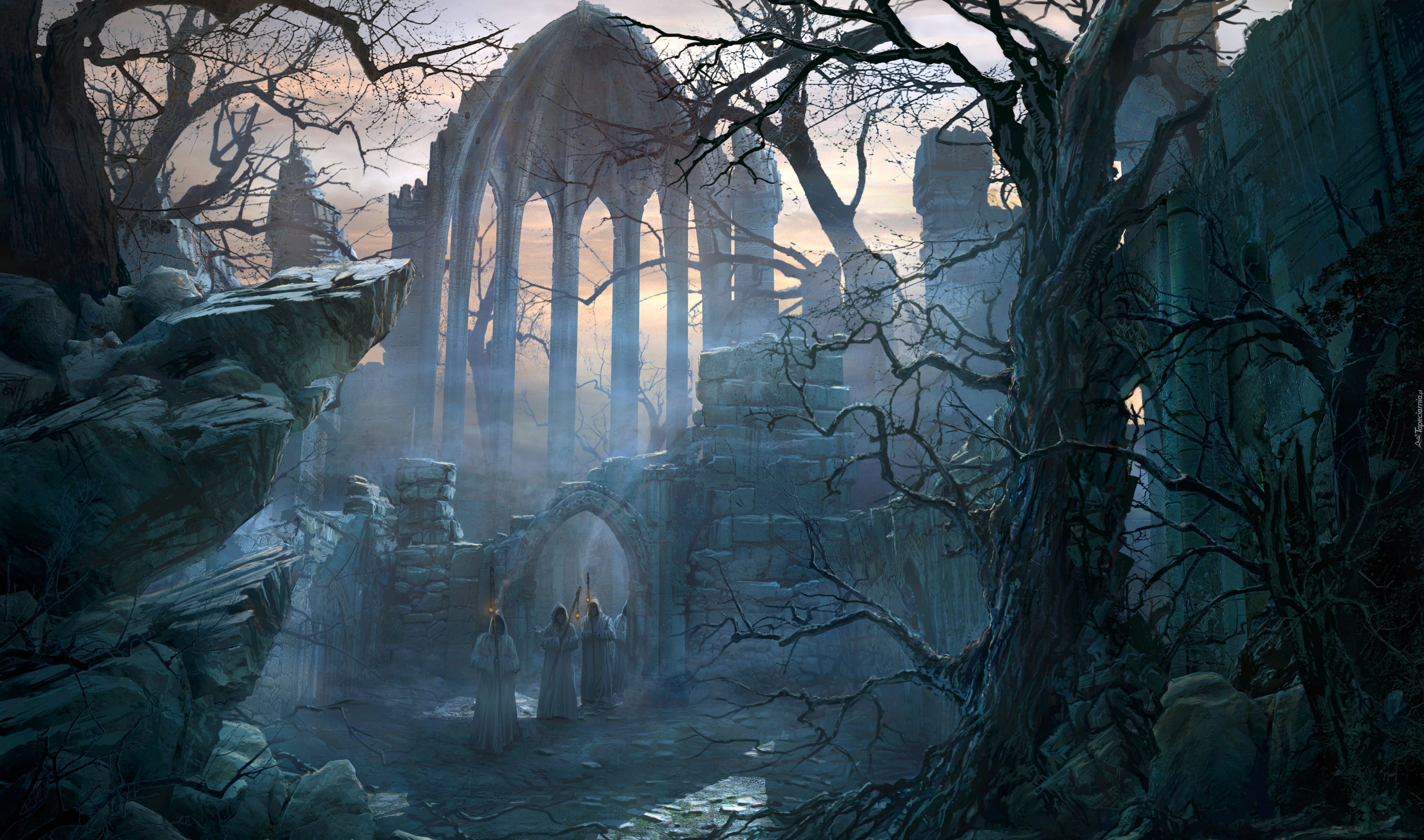 Edytor tapety: Mnisi obok ruin świątyni w grafice fantasy