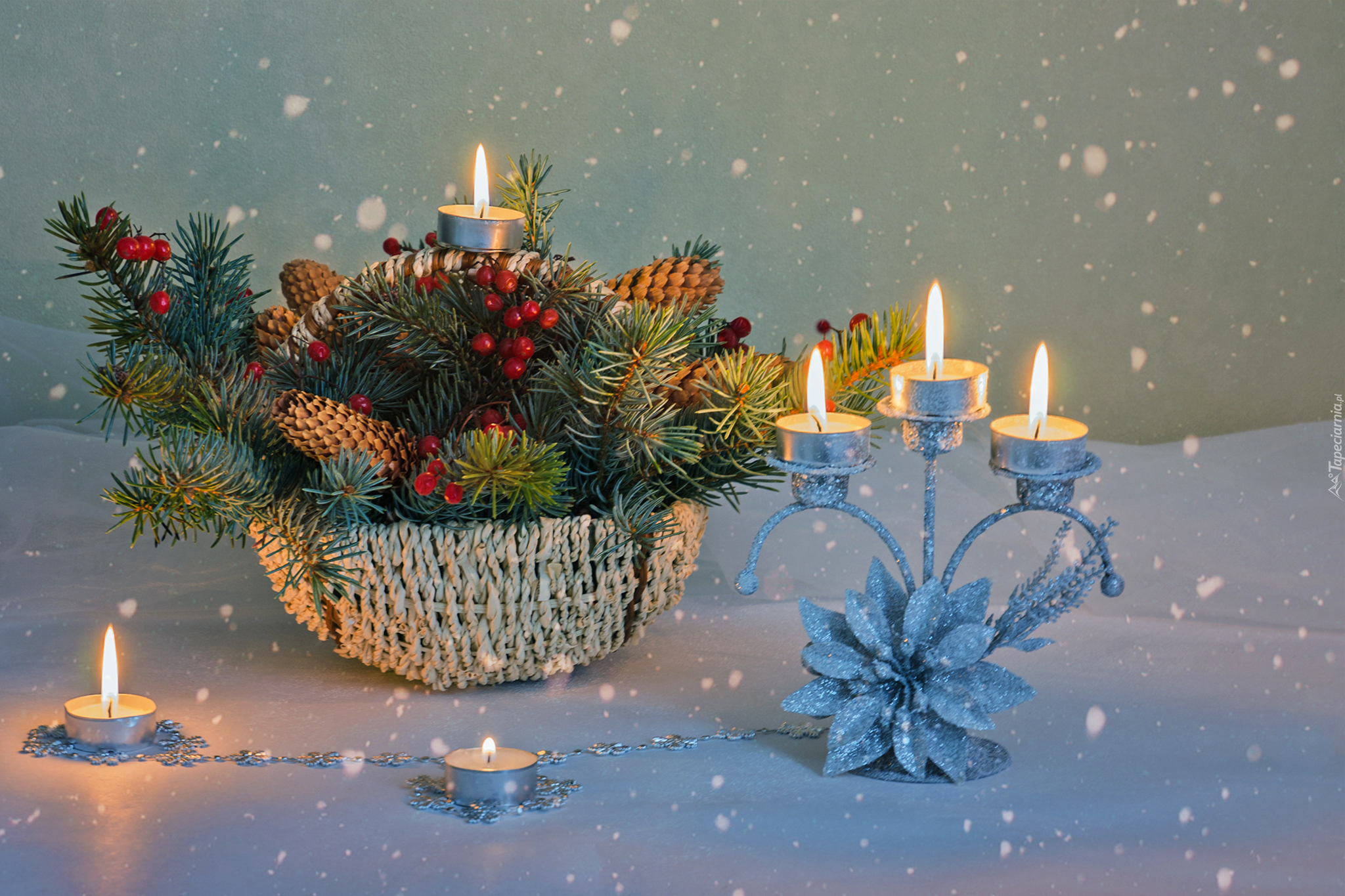 Edytor tapety: Świąteczny stroik obok świecznika z zapalonymi świecami