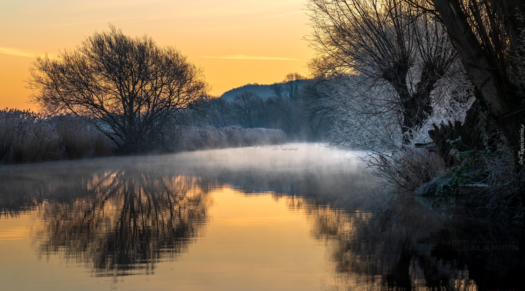 Edytor tapety: Kaczki we mgle na jeziorze otoczonym oszronionymi drzewami
