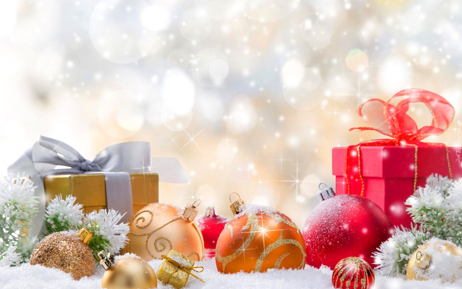 Edytor tapety: Prezenty i bombki w sztucznym śniegu