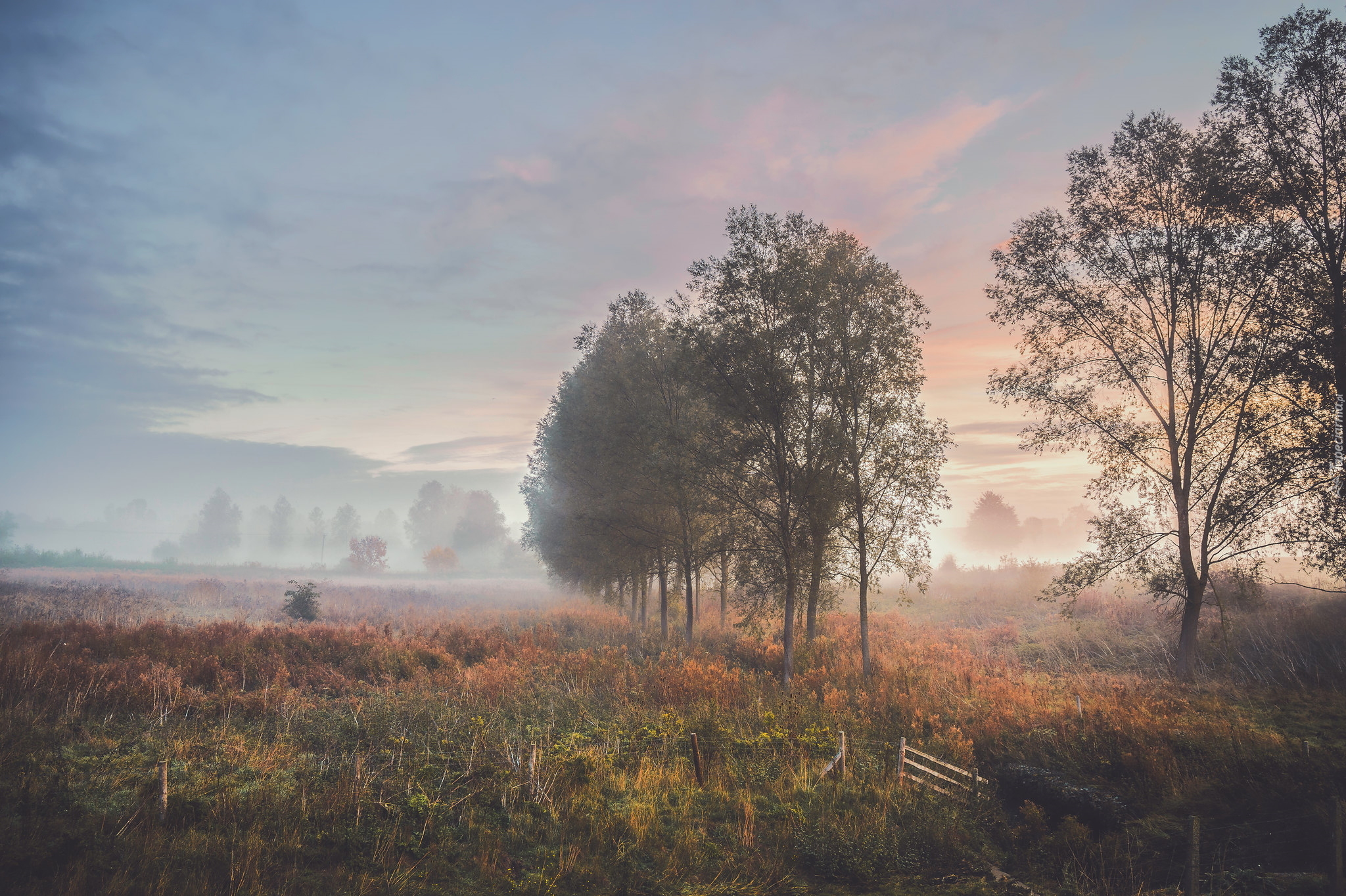 Edytor tapety: Drzewa na zamglonej łące
