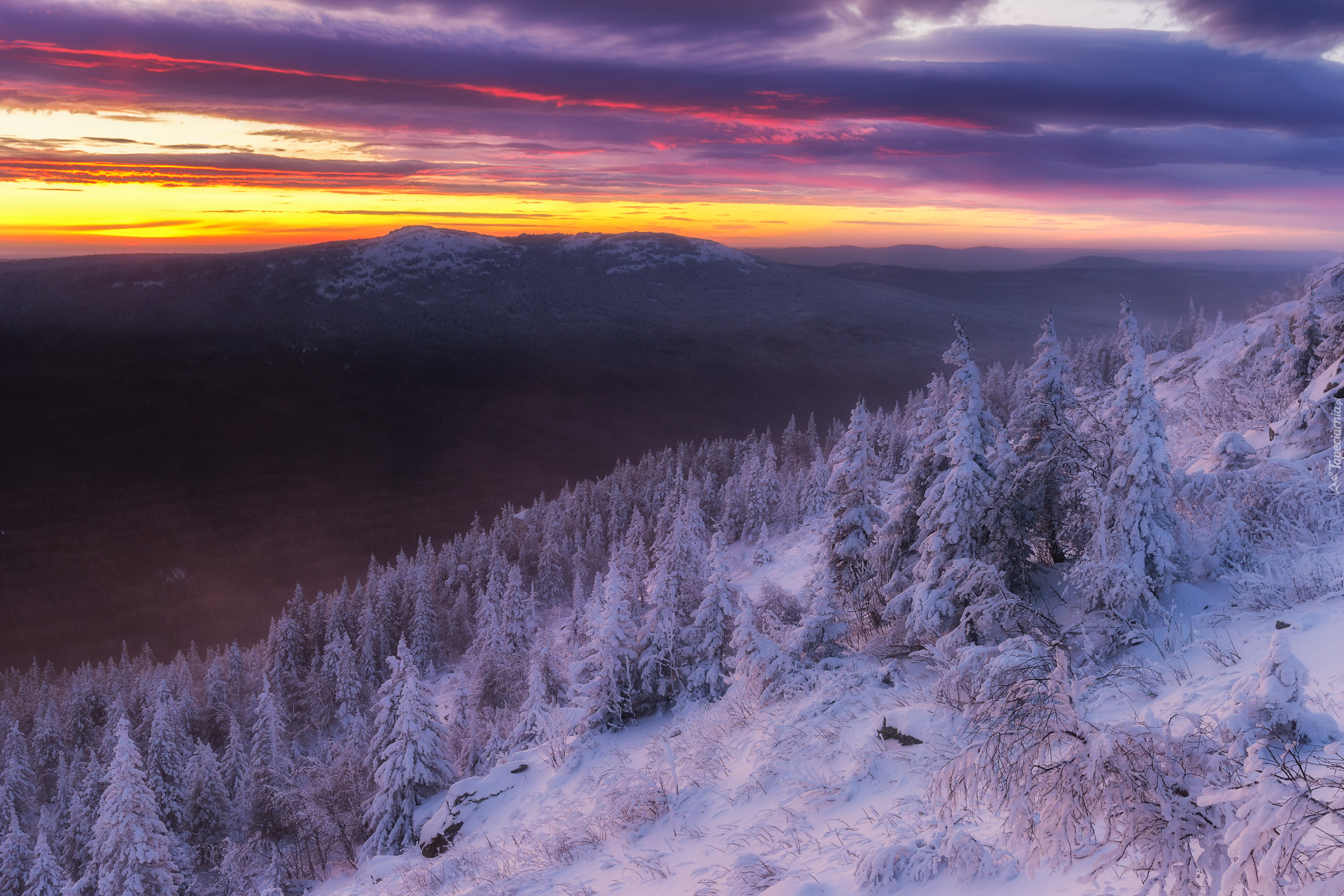 Edytor tapety: Oszronione świerki na wzgórzu o wschodzie słońca