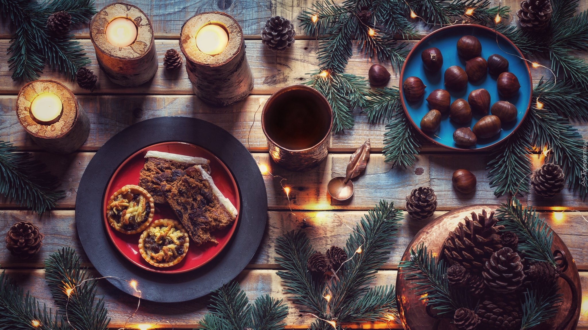 Edytor tapety: Kasztany szyszki i ciastka obok zapalonych świec