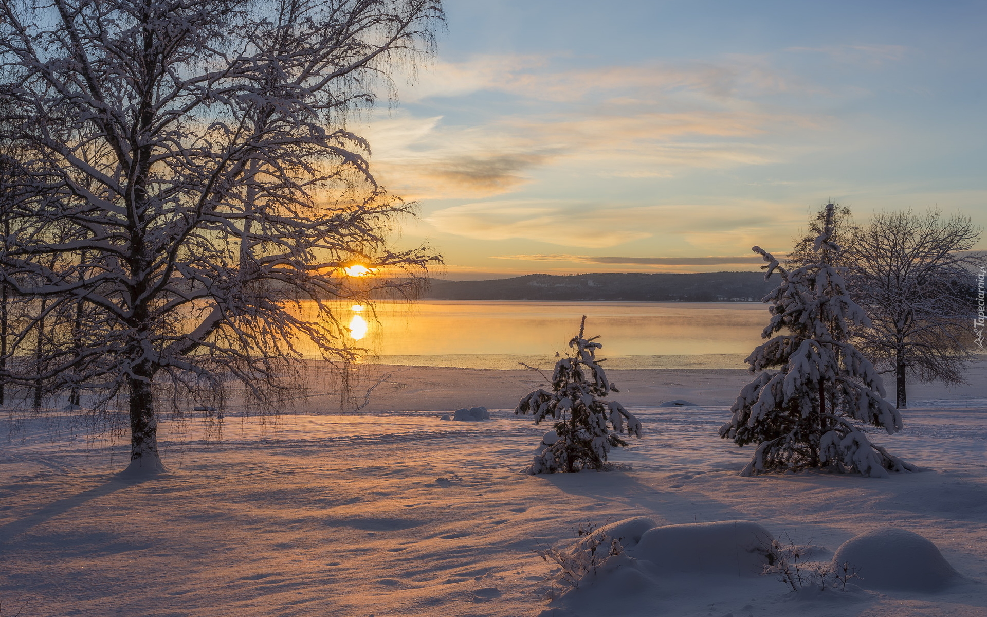 Edytor tapety: Zimowy zachód słońca nad jeziorem Glafsfjorden w Szwecji