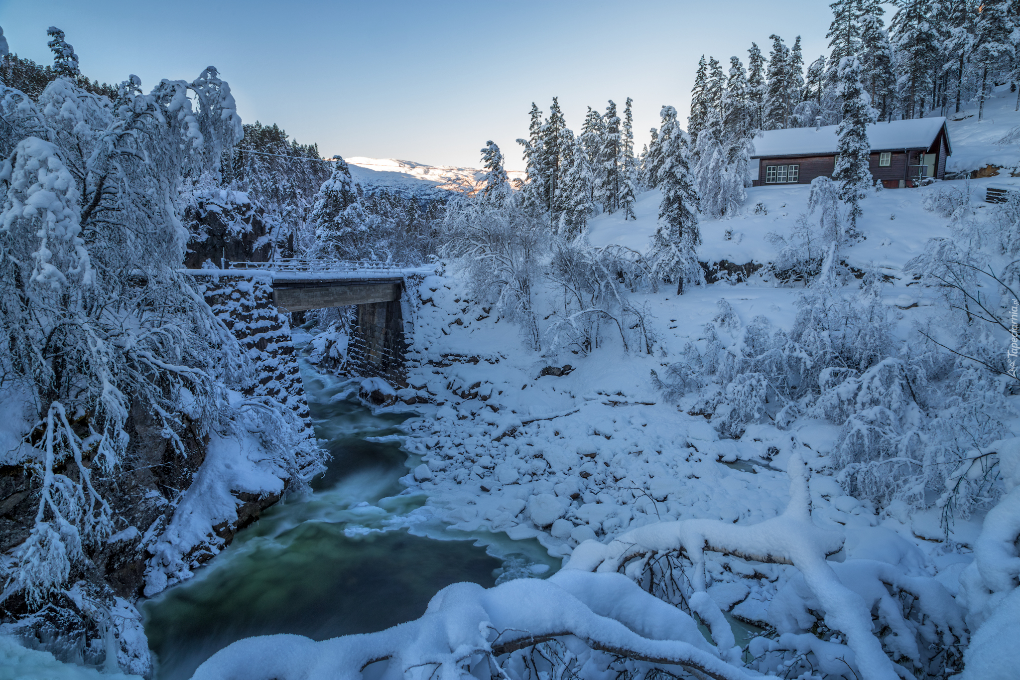 Edytor tapety: Ośnieżony dom i drzewa w pobliżu rzeki