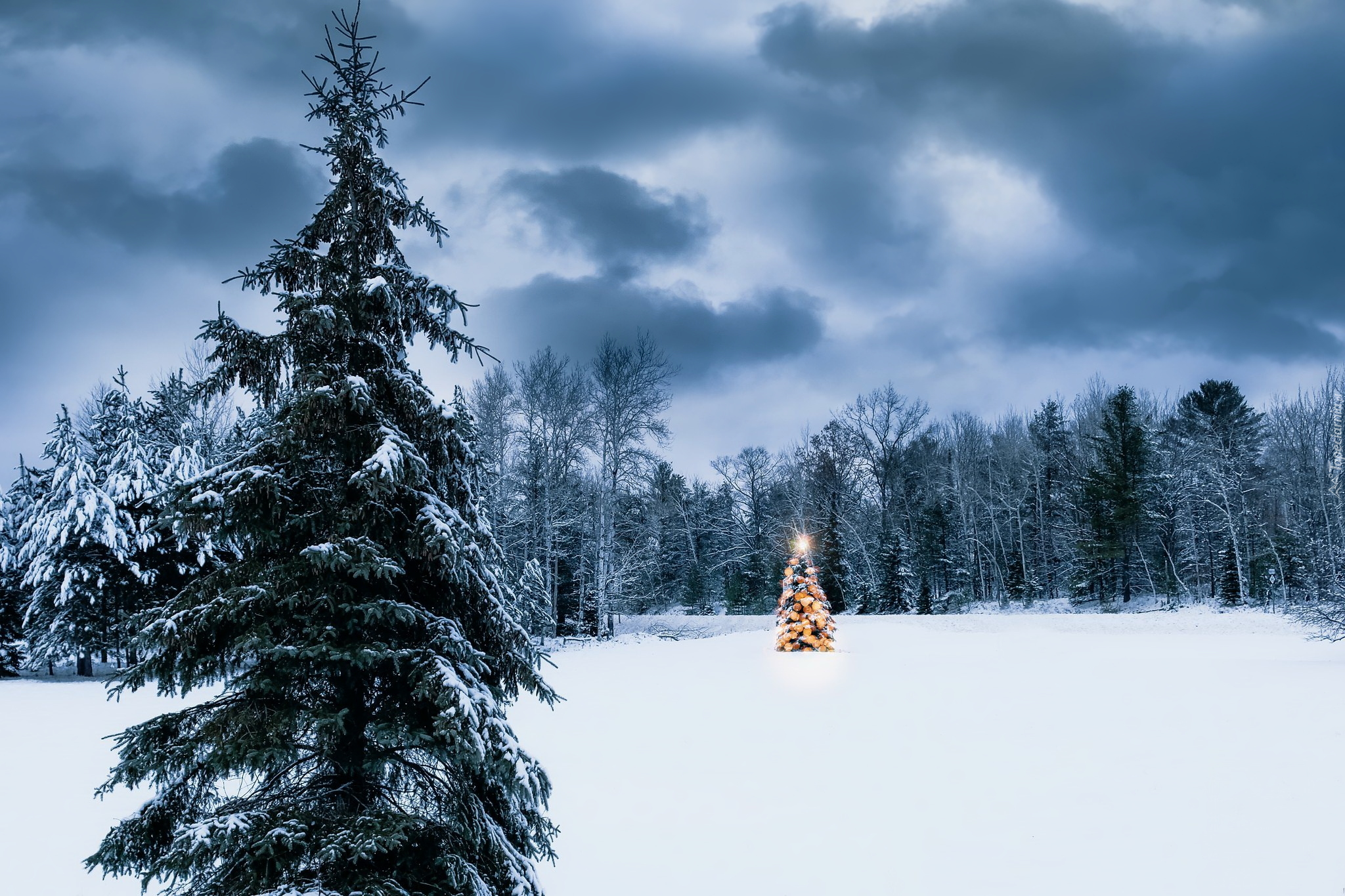 Edytor tapety: Udekorowana choinka na leśnej polanie