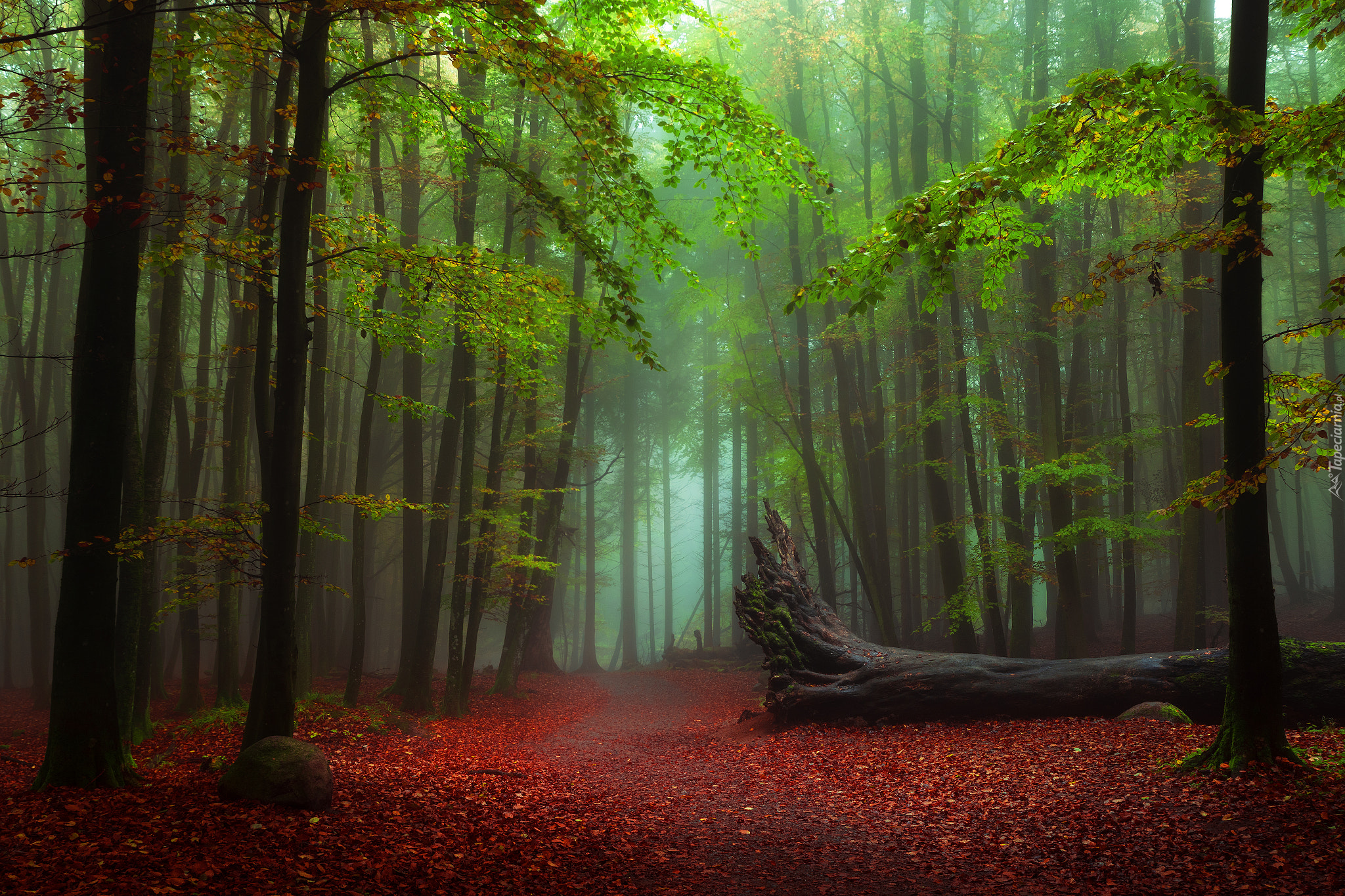 Edytor tapety: Powalone drzewo w lesie przy leśnej drodze