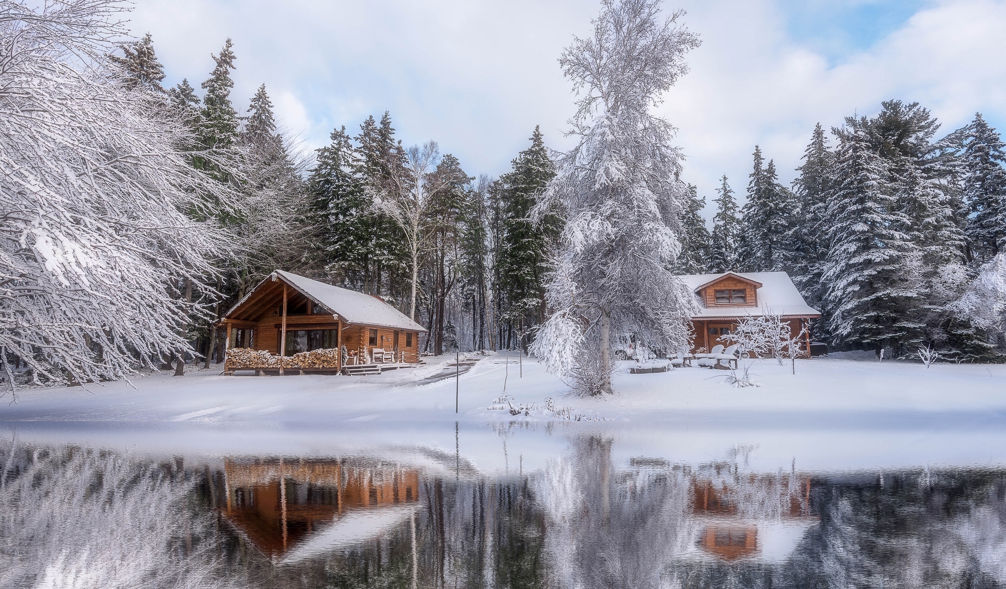 Edytor tapety: Domki pośród ośnieżonych drzew nad jeziorem