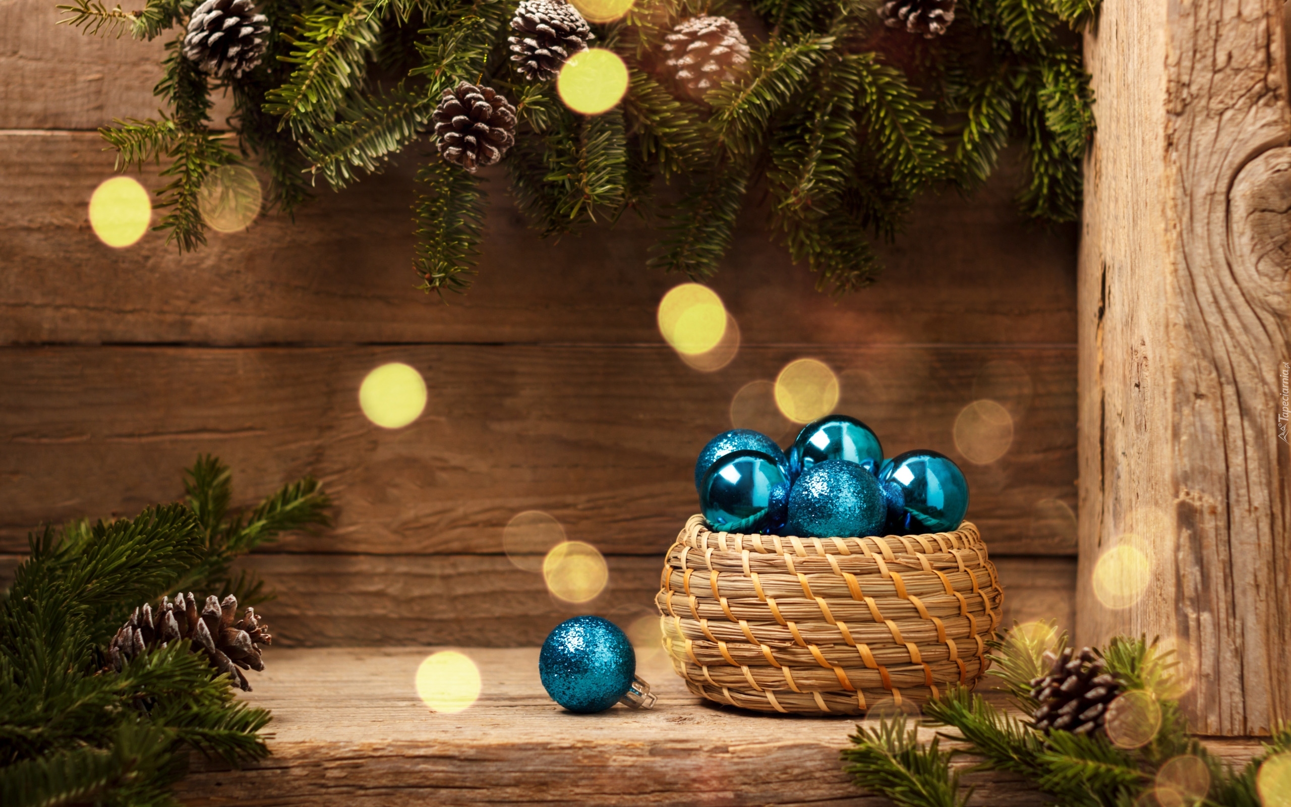 Edytor tapety: Niebieskie bombki w koszyku pod gałązkami