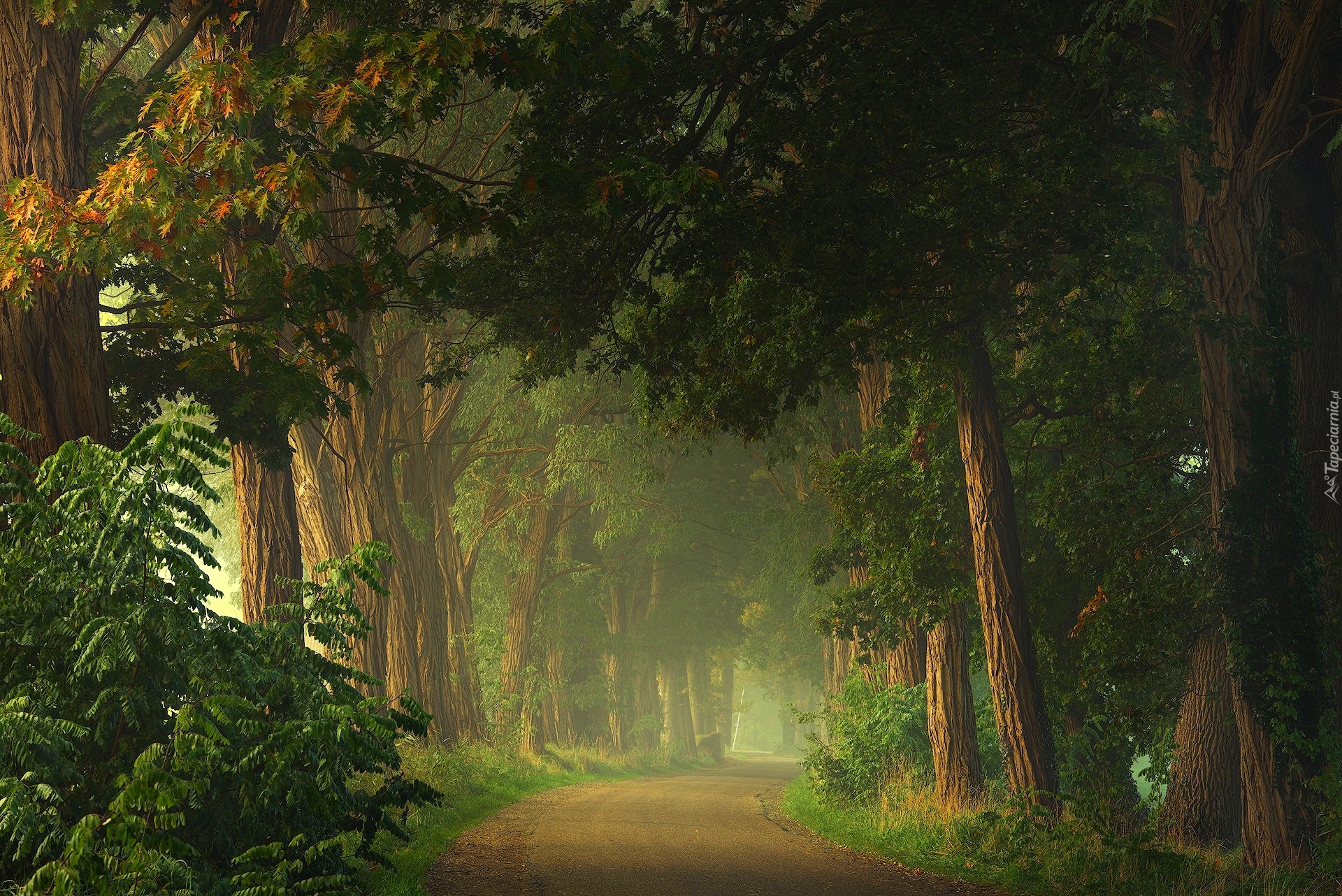 Edytor tapety: Droga w zamglonym o poranku lesie