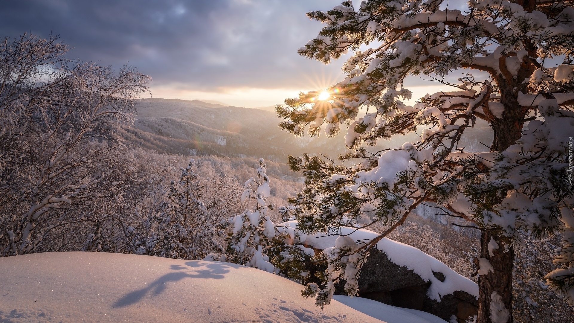 Edytor tapety: Promienie słońca w gałęziach ośnieżonej sosny