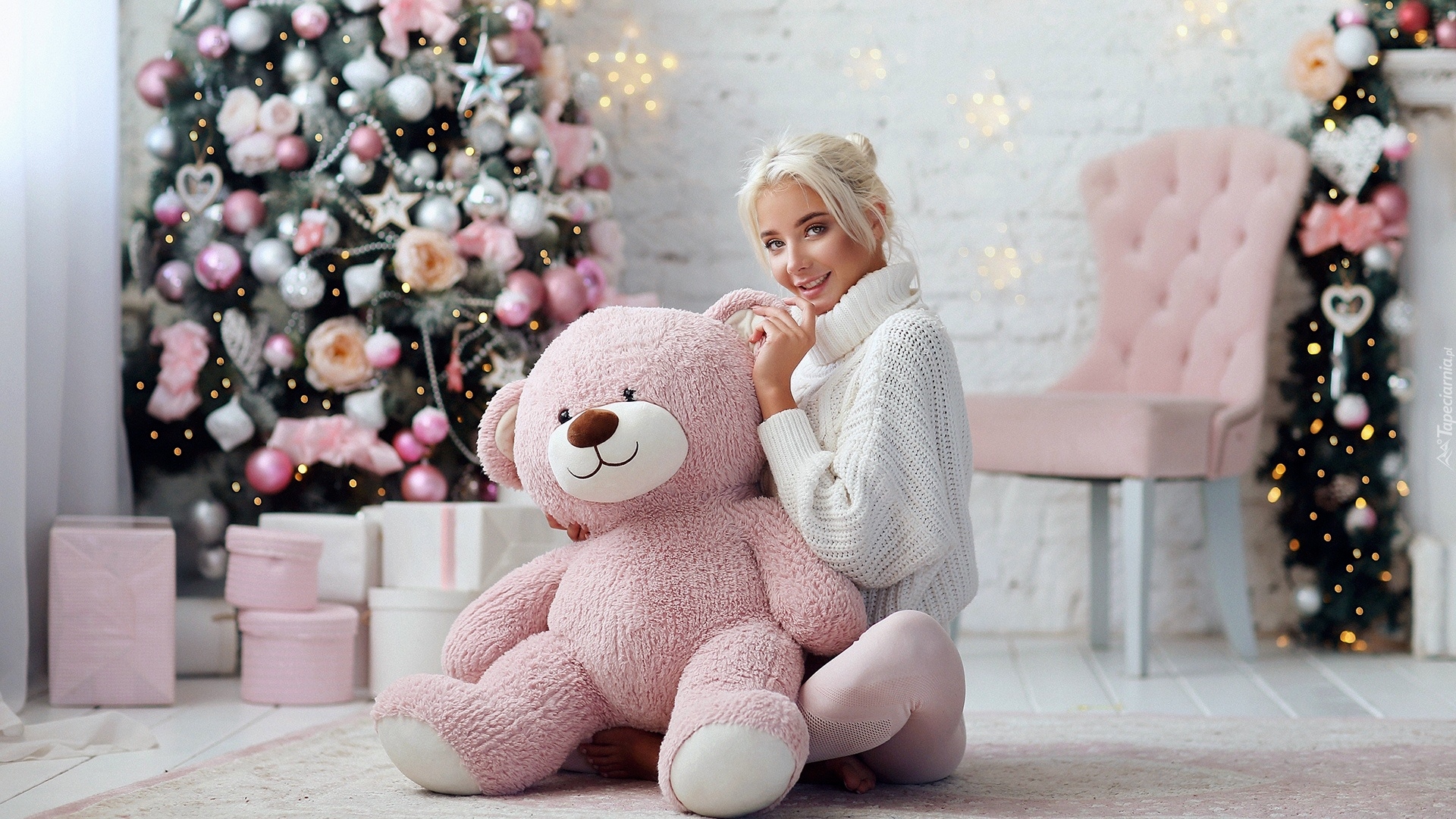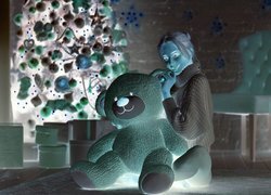 Edytor tapety: Dziewczyna z misiem przy choince