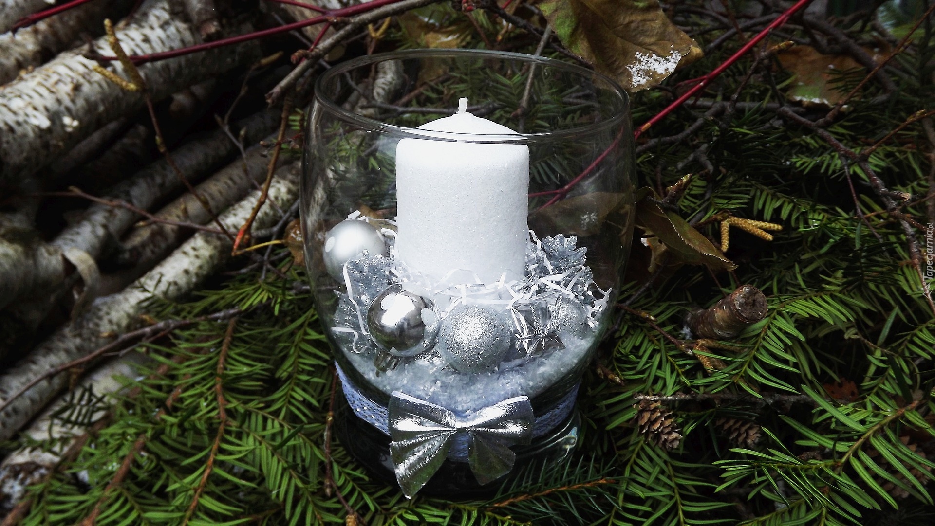 Edytor tapety: Świeczka w szklance na gałązkach