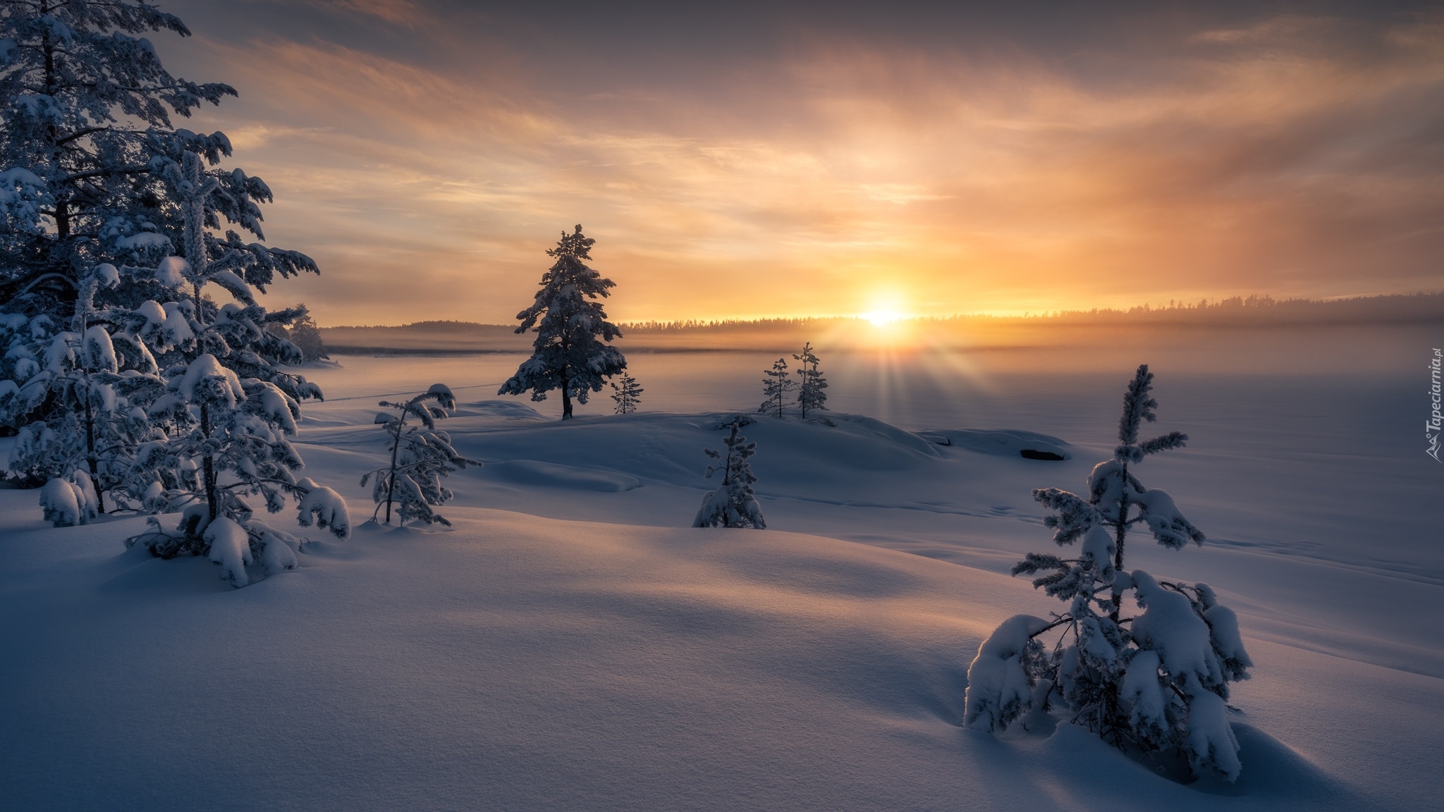 Edytor tapety: Ośnieżone drzewa na polu w promieniach wschodzącego słońca