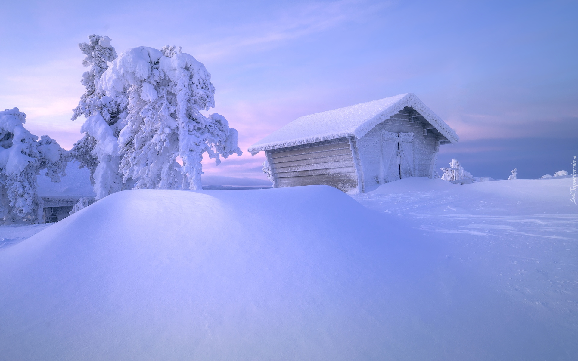 Edytor tapety: Ośnieżone drzewa i szopa w głębokich zaspach