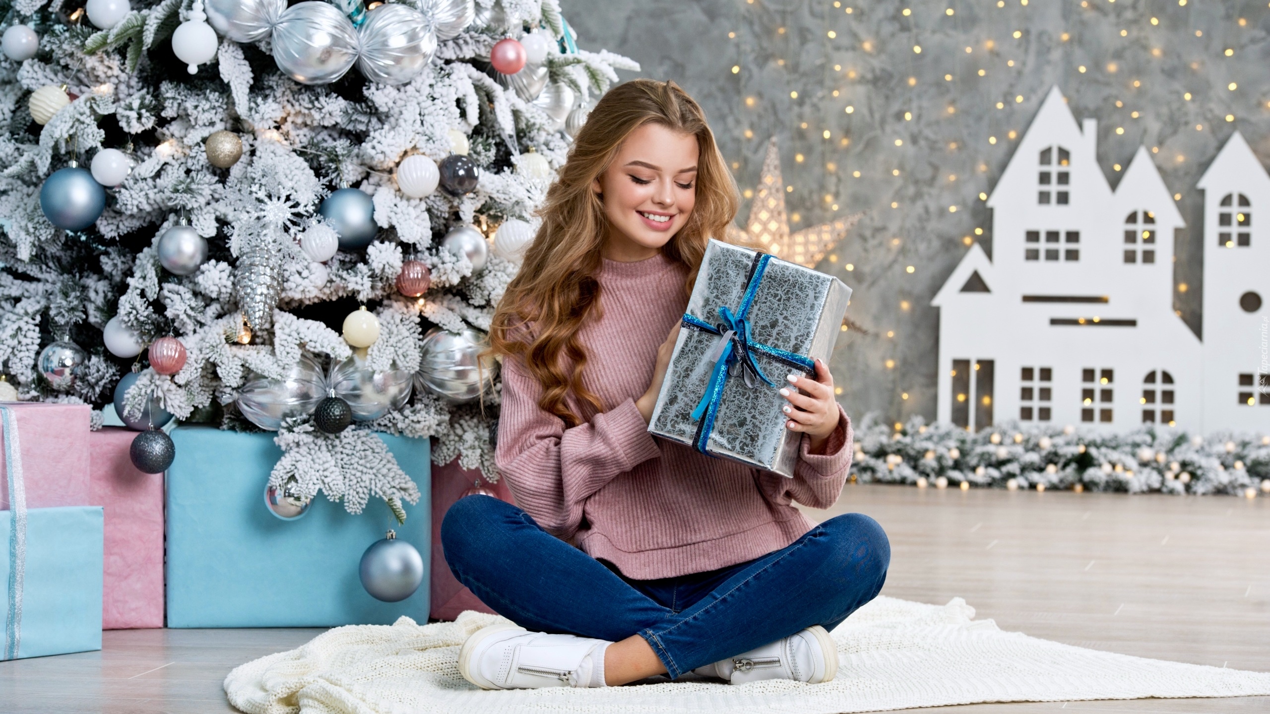 Edytor tapety: Dziewczyna z prezentem obok choinki