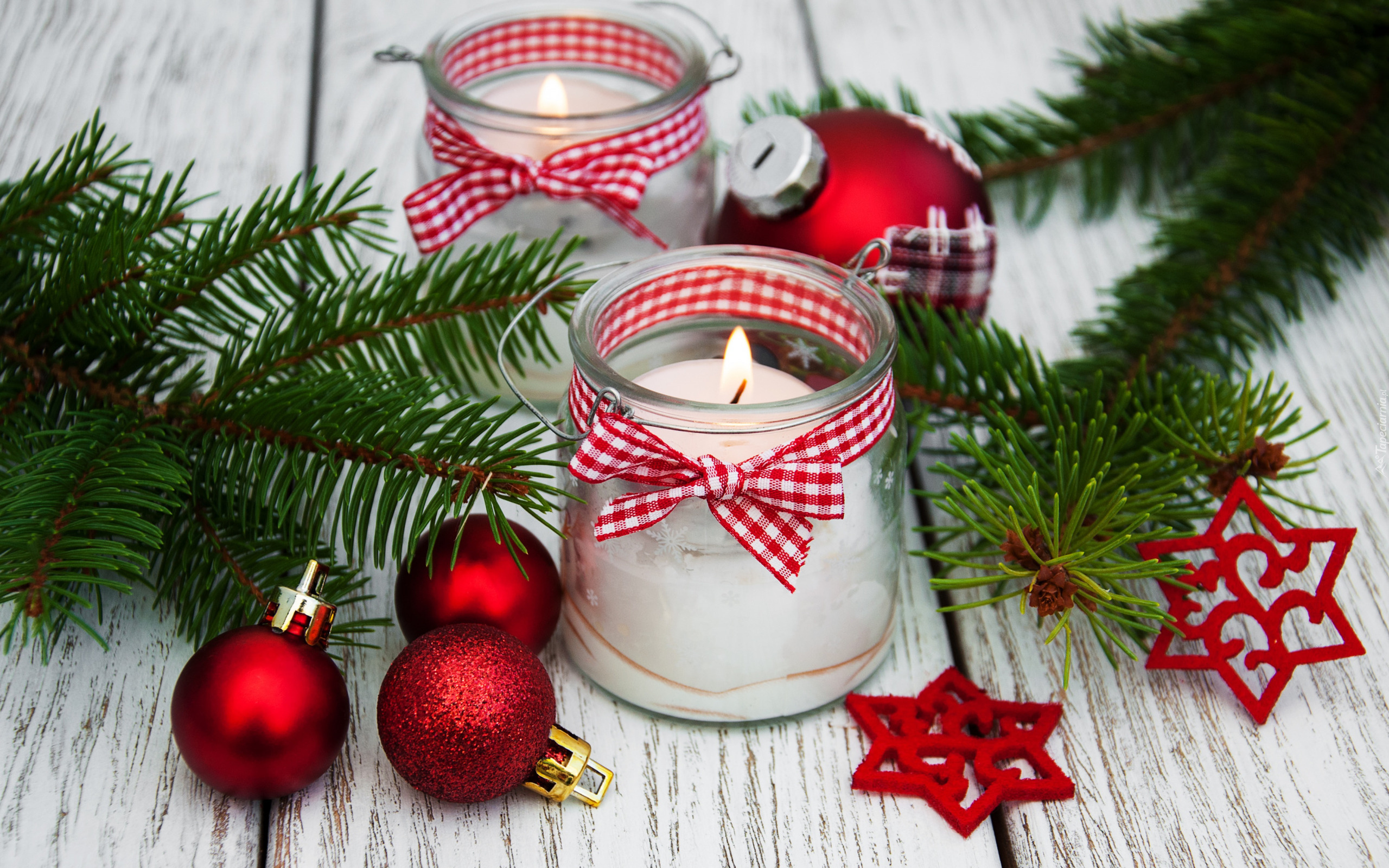 Edytor tapety: Świece obok bombek i gałązek choinki