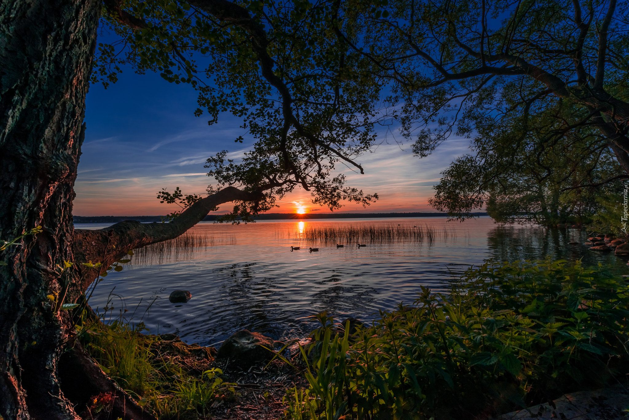 Edytor tapety: Kaczki na jeziorze w zachodzącym słońcu