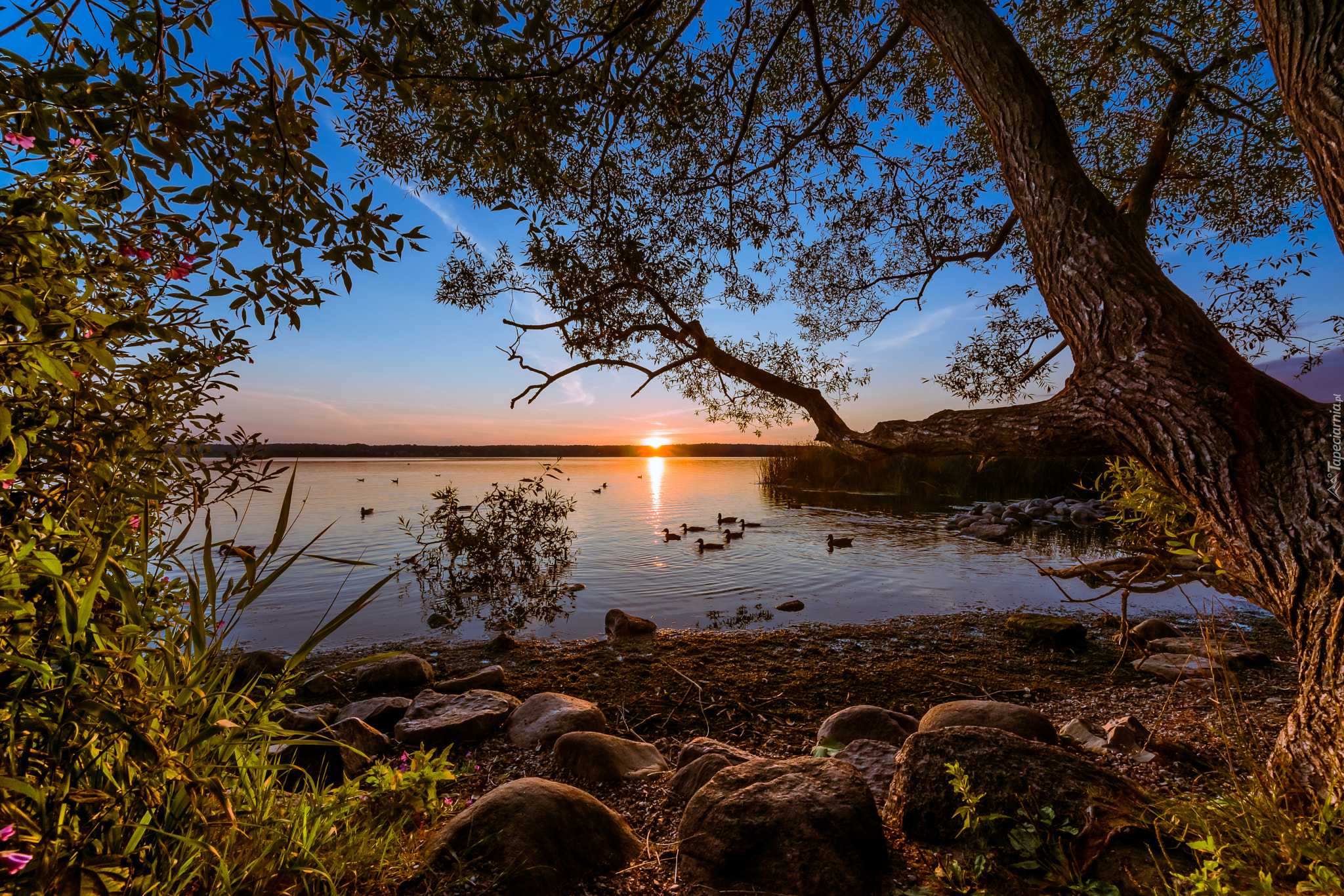 Edytor tapety: Kaczki pływające po jeziorze o wschodzie słońca