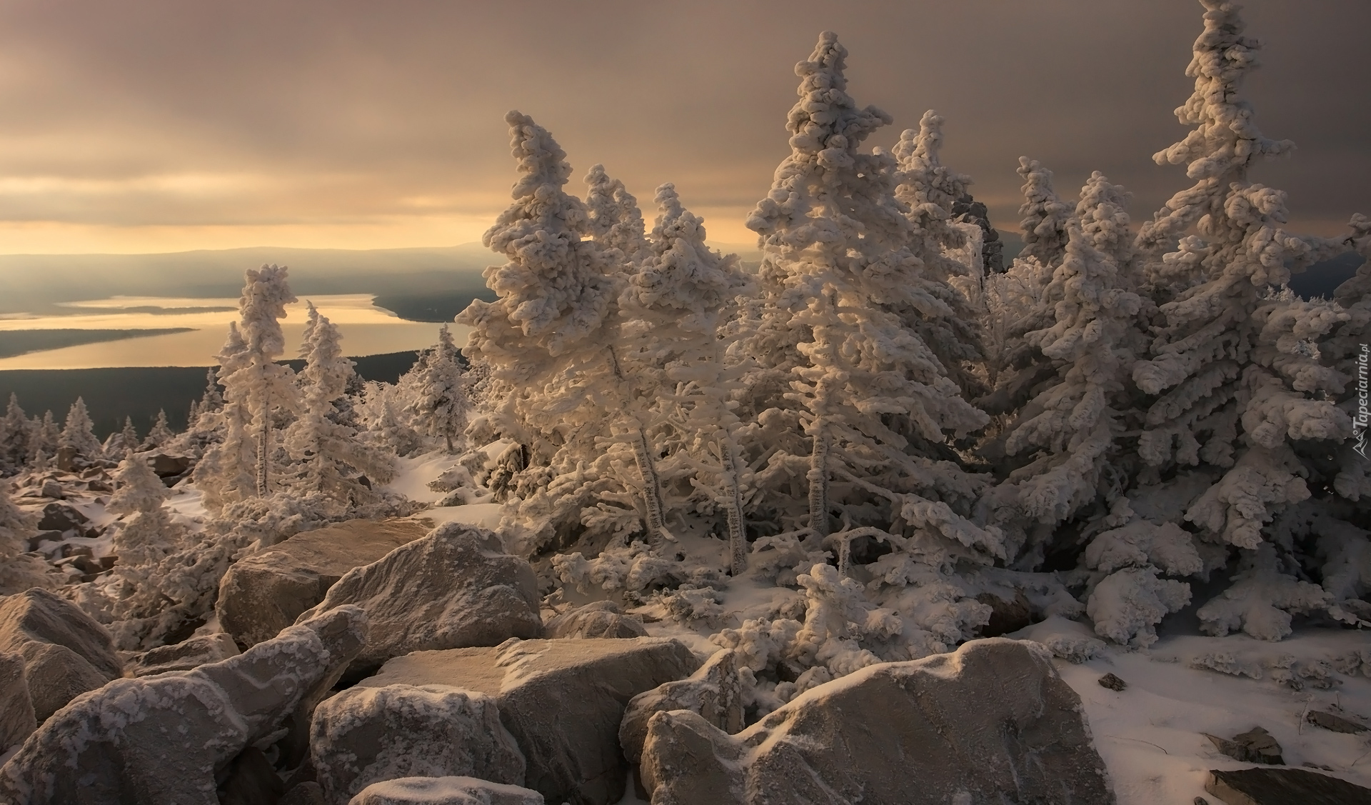 Edytor tapety: Ośnieżone kamienie i drzewa