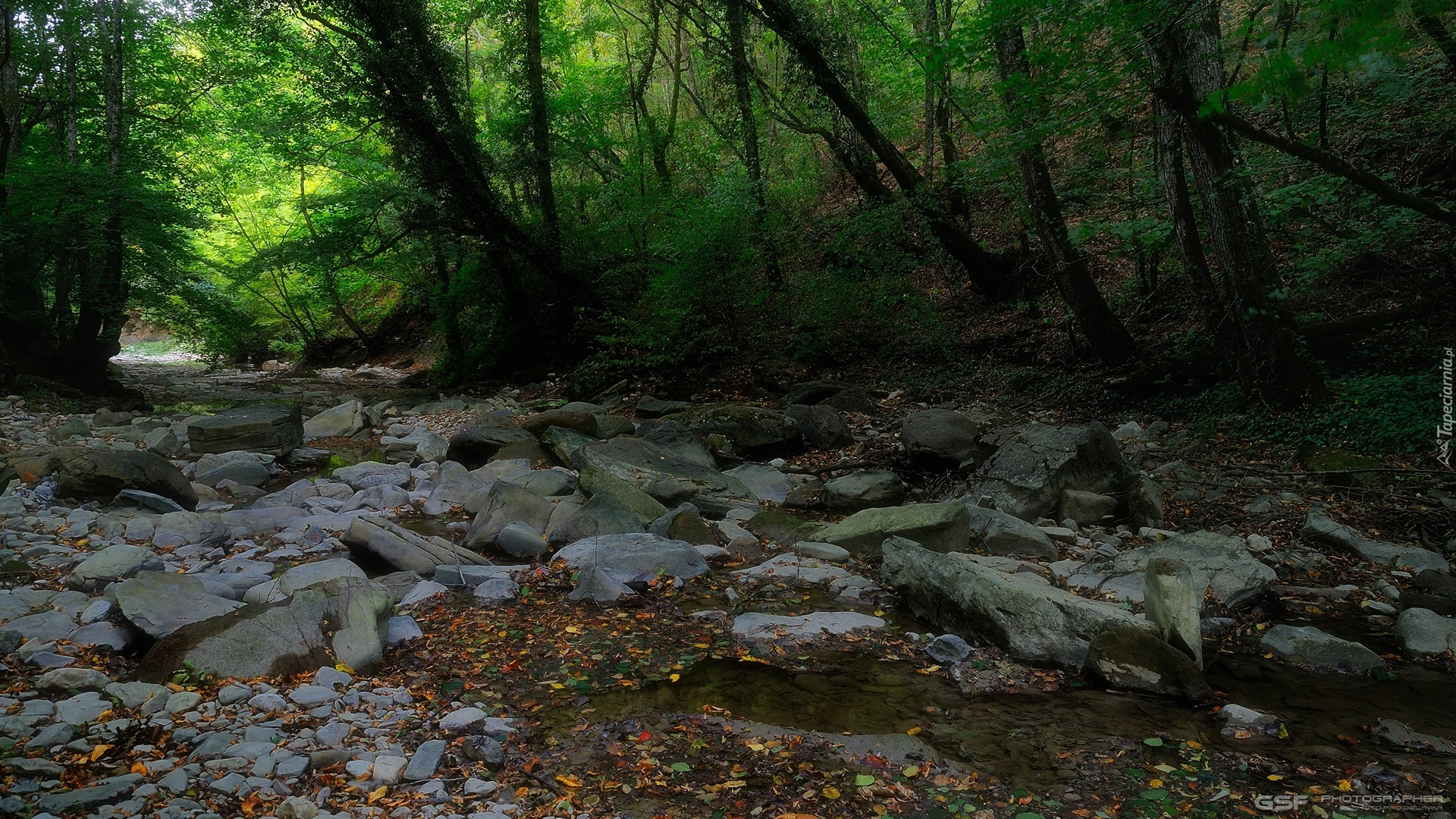Edytor tapety: Zielone drzewa nad kamieniami w lesie