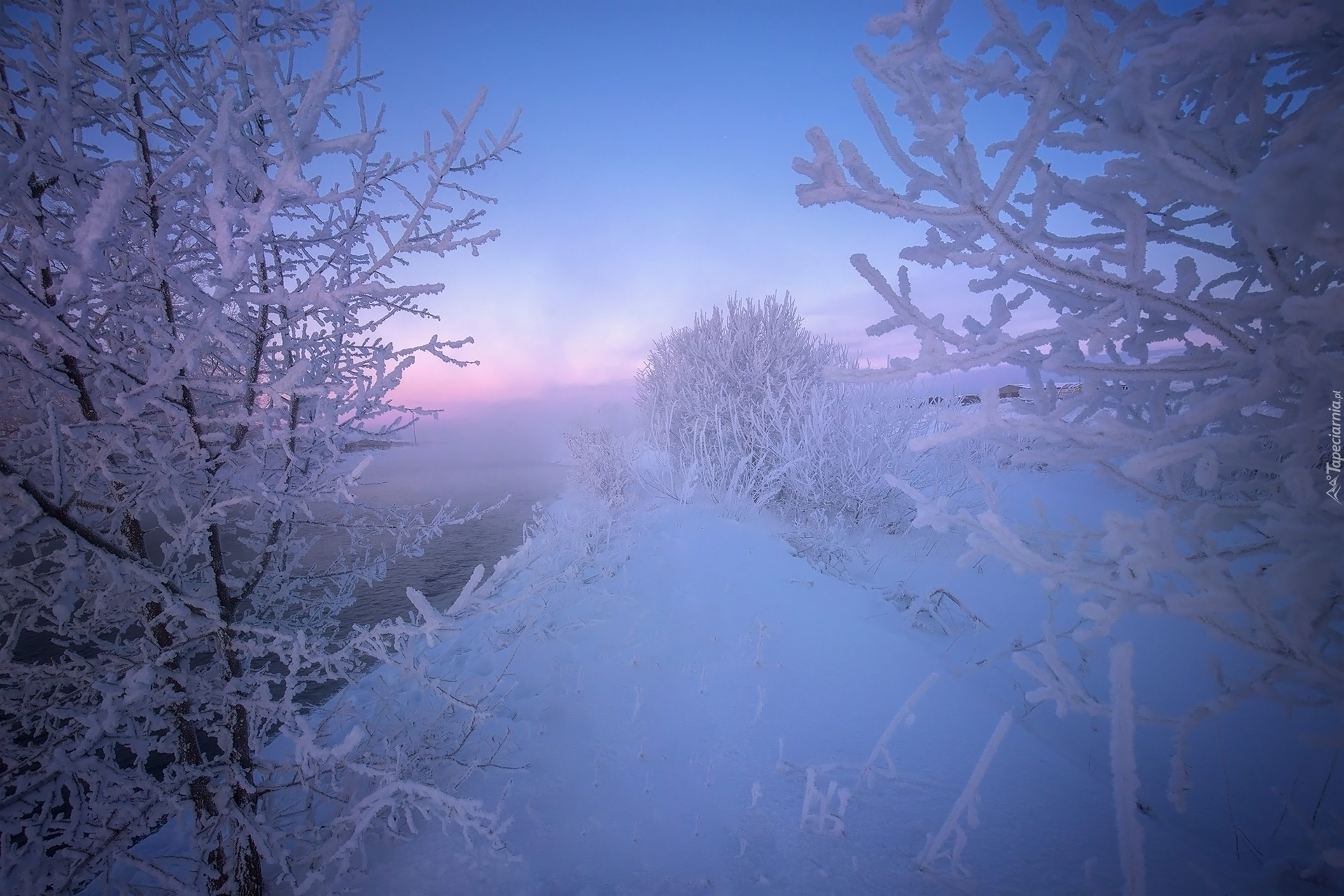 Edytor tapety: Oszronione drzewa nad zamgloną o poranku rzeką