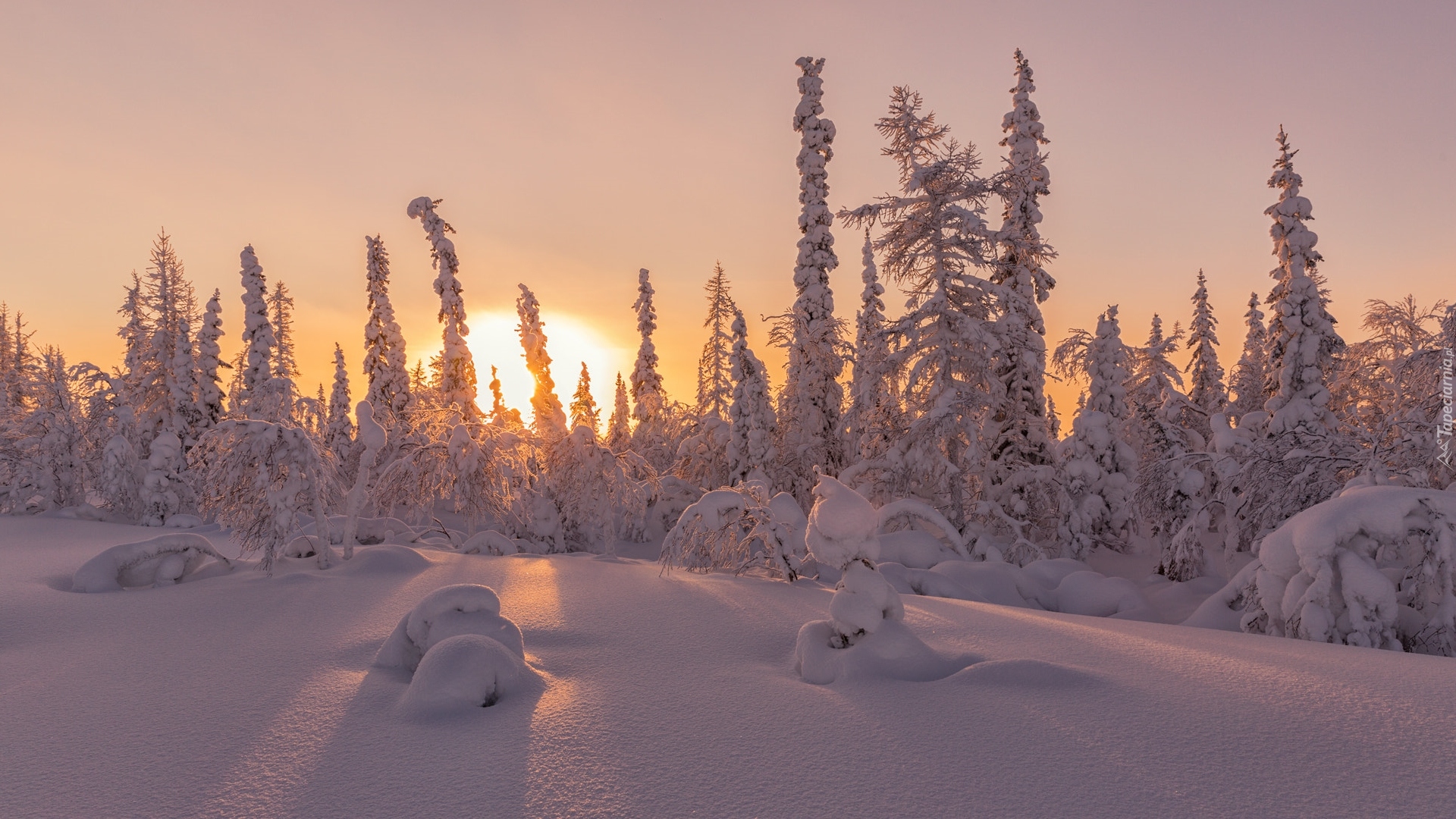 Edytor tapety: Wschód słońca nad zasypanymi śniegiem drzewami