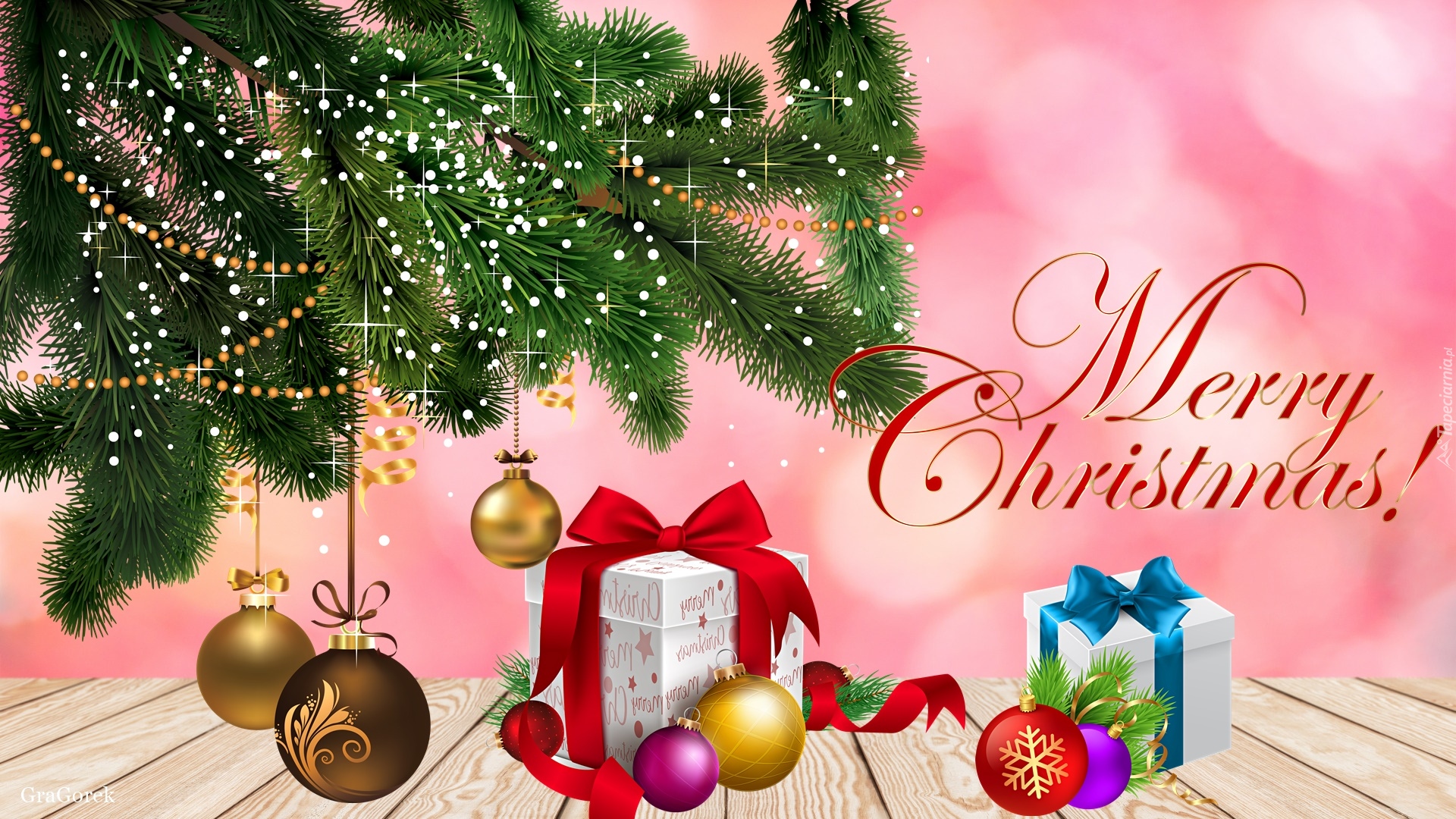 Edytor tapety: Prezenty i bombki wraz z życzeniami na święta