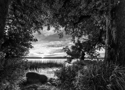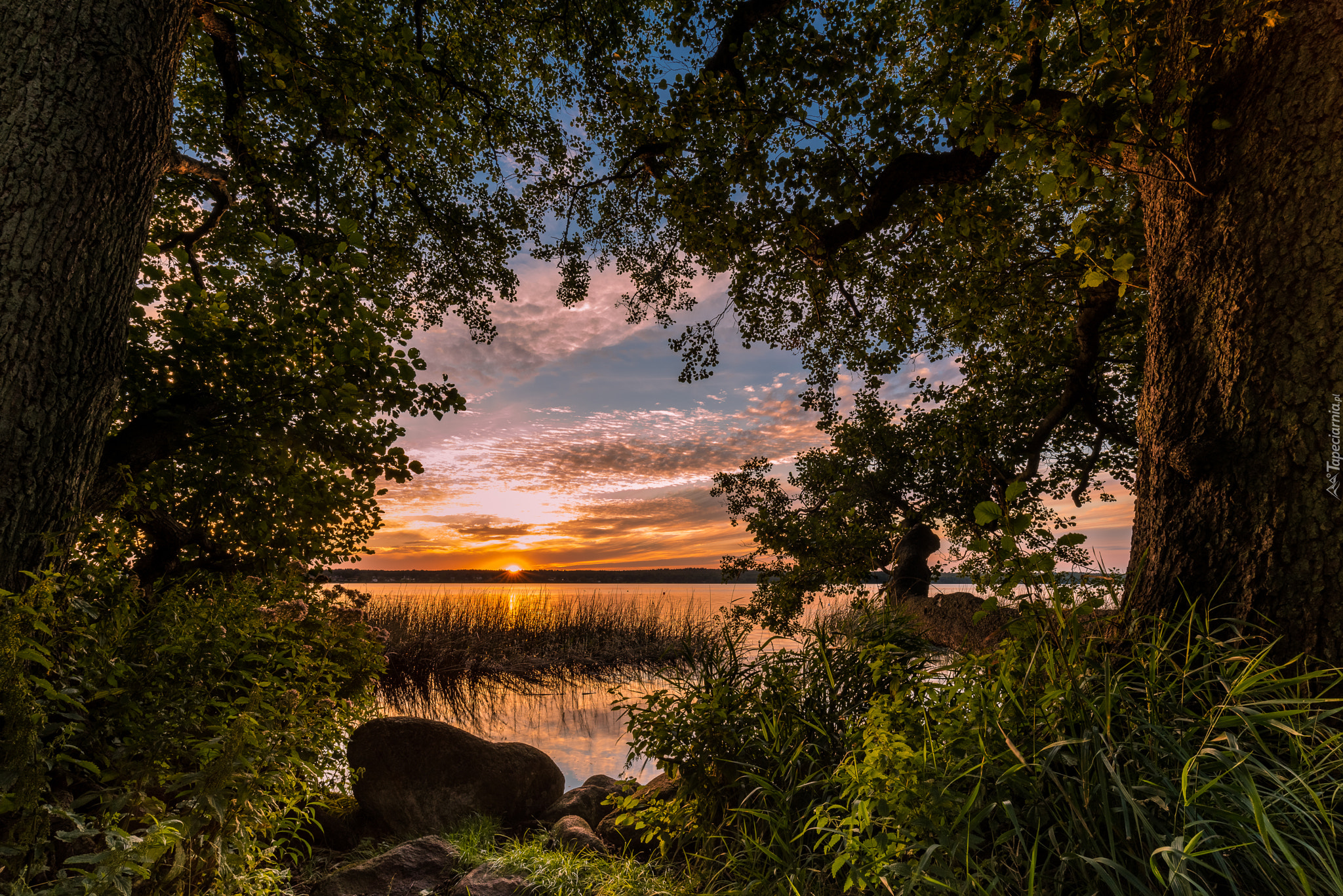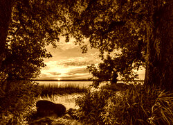 Edytor tapety: Drzewa na brzegu jeziora w promieniach zachodzącego słońca